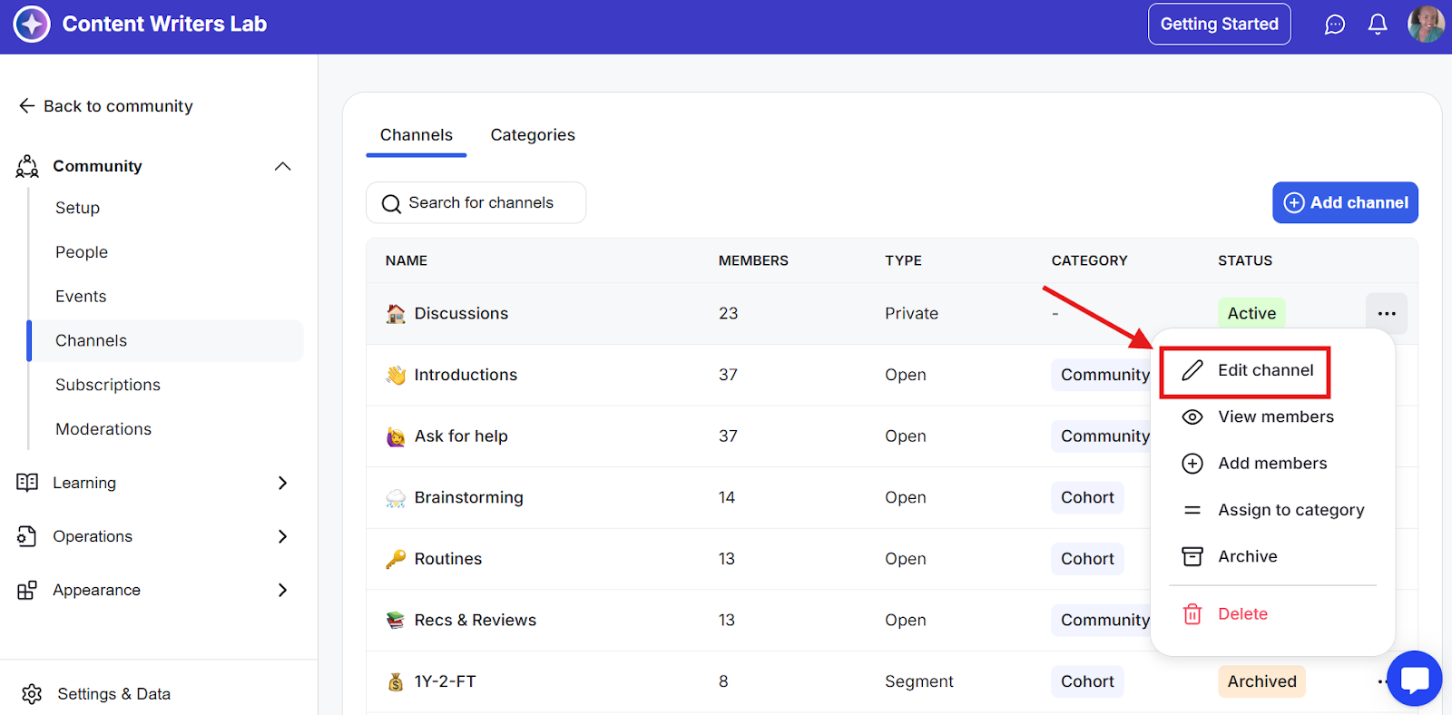 Step 3: Find the channel you want to modify and click the three-dot menu to the right of its name. From the menu that appears, select Edit Channel.