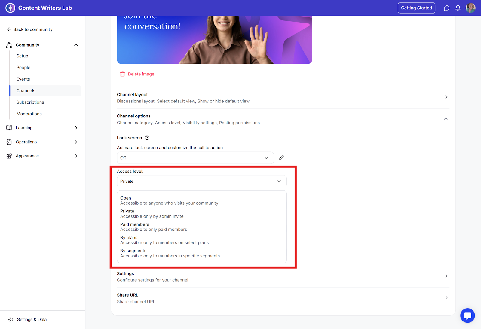 Channels help organize discussions in your community. You can control who can see and participate in each channel by setting its access level. There are five access levels available: