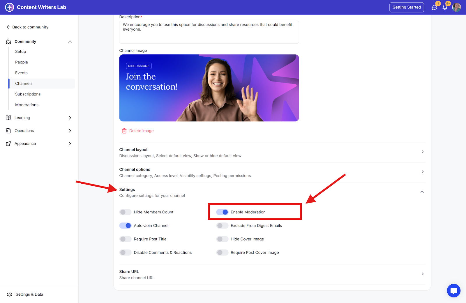 Step 4: Scroll down to the Settings section and toggle on Enable Moderation.