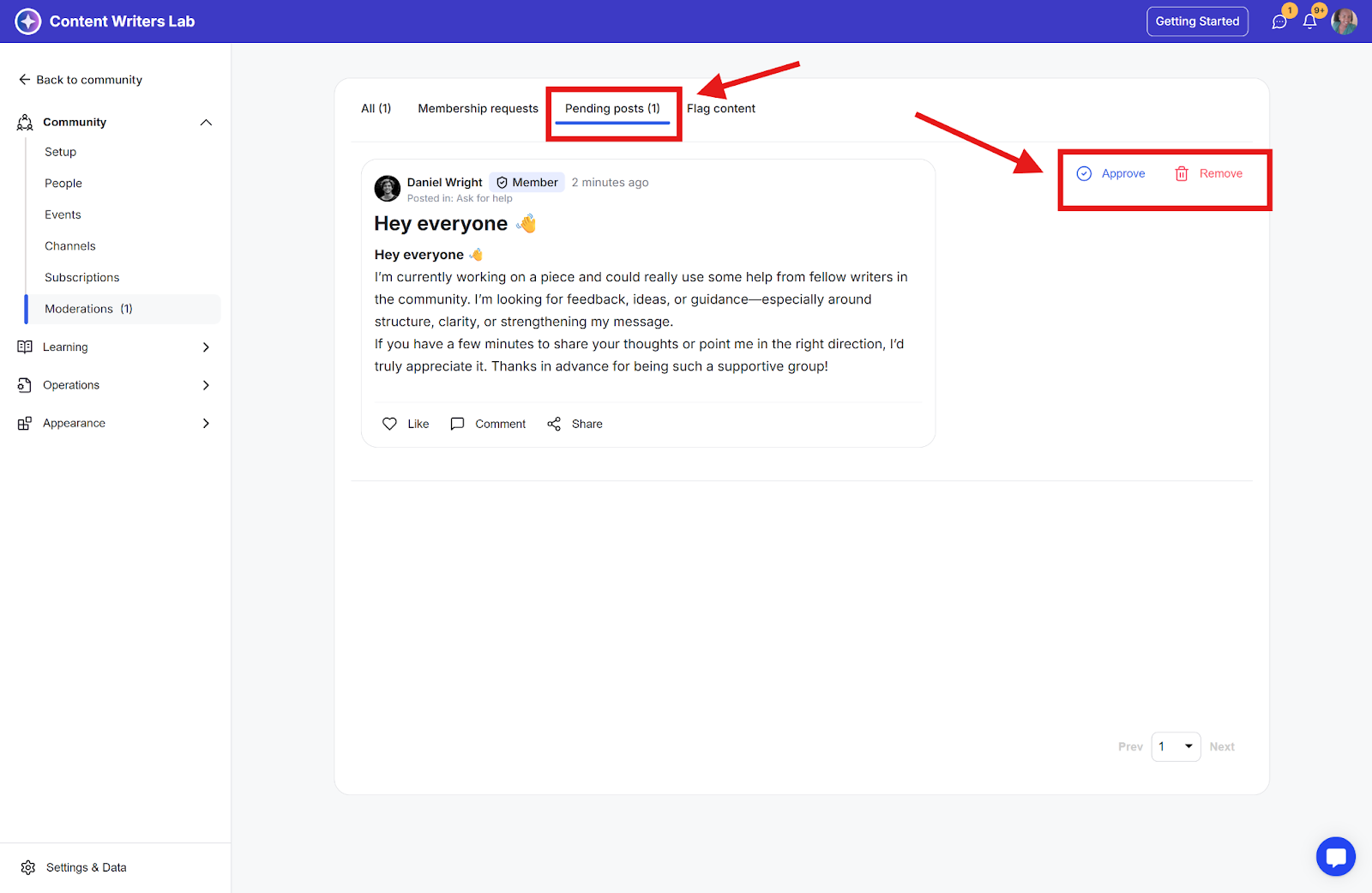 Step 3: Click the Pending Posts tab, where you can approve or remove the moderated posts.