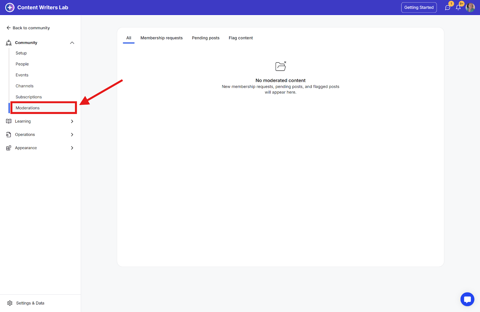 Step 2: Go to the Community dropdown and click Moderations in the side menu.