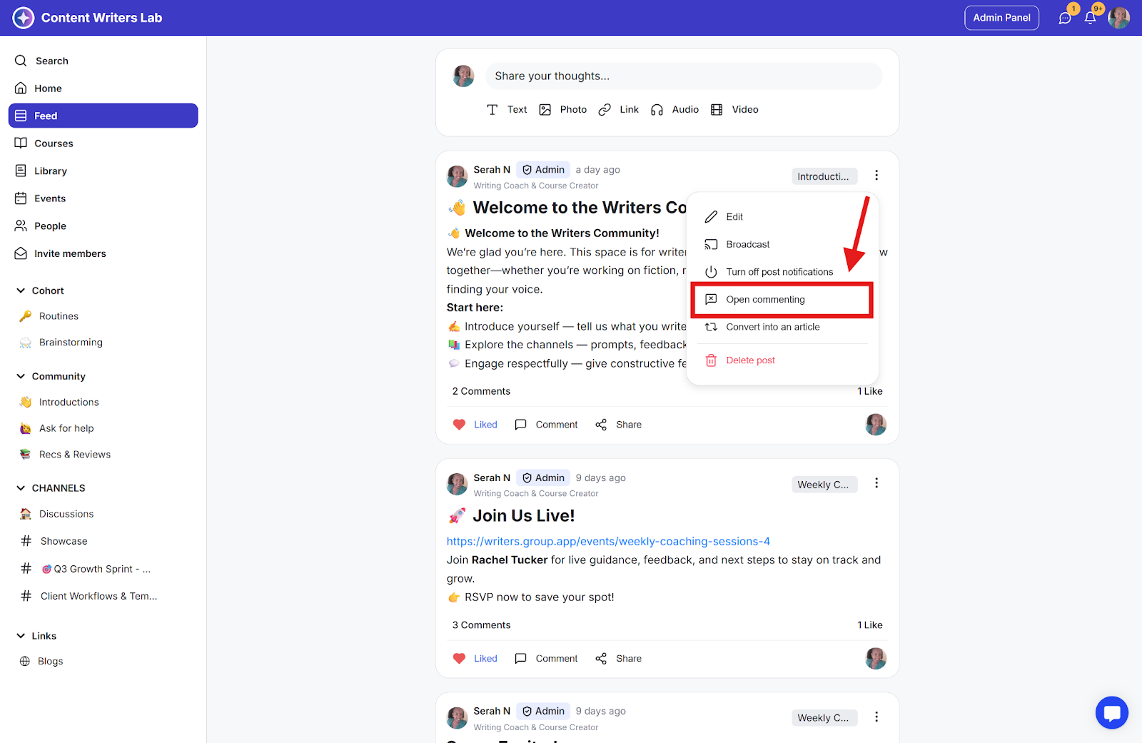 Step 3: To enable commenting, click again on the post's three-dot icon and click the Open Commenting option.