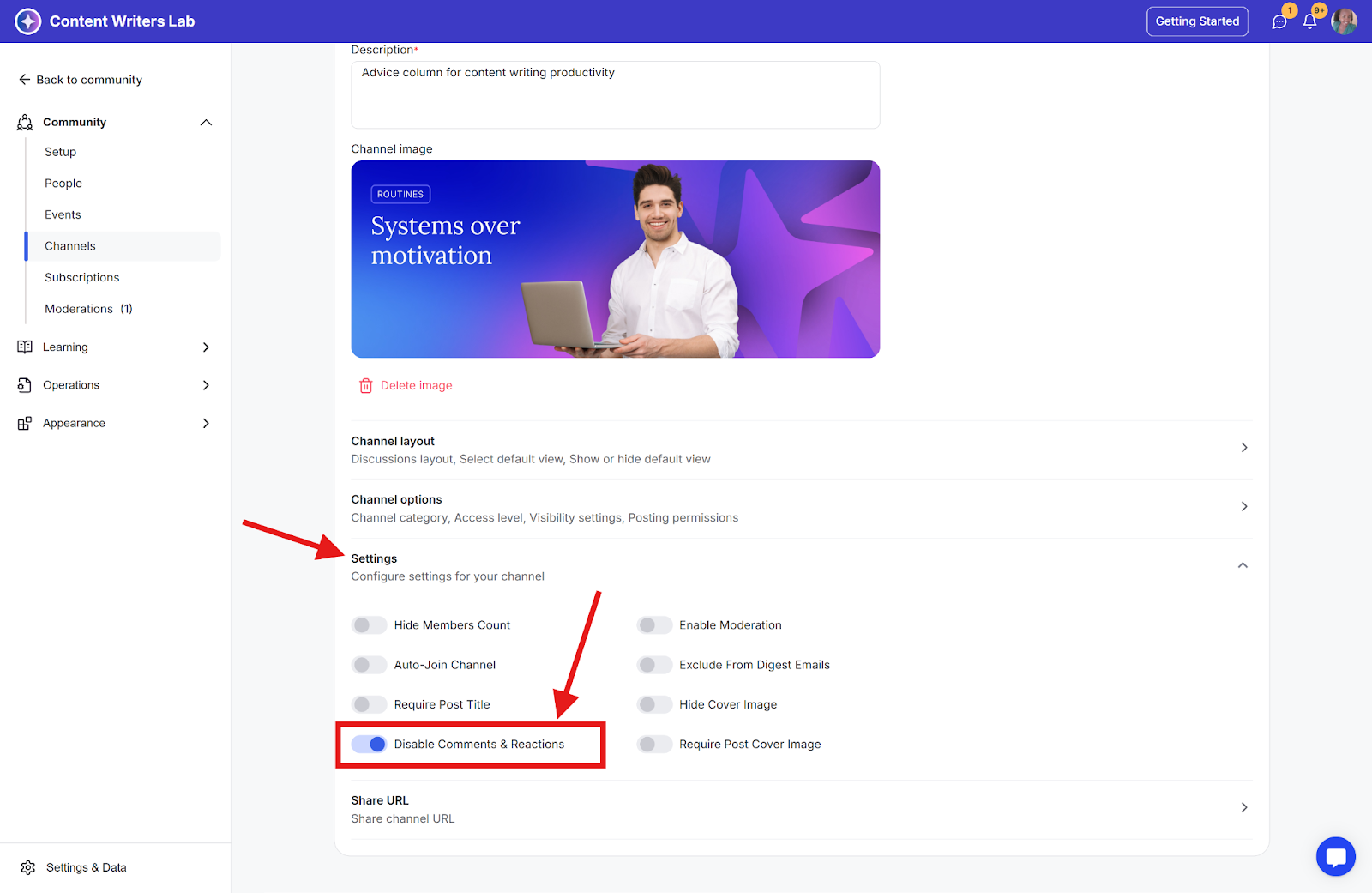 Step 2: Scroll down to the Settings section and toggle on ‘Disable Comments and Reactions’.