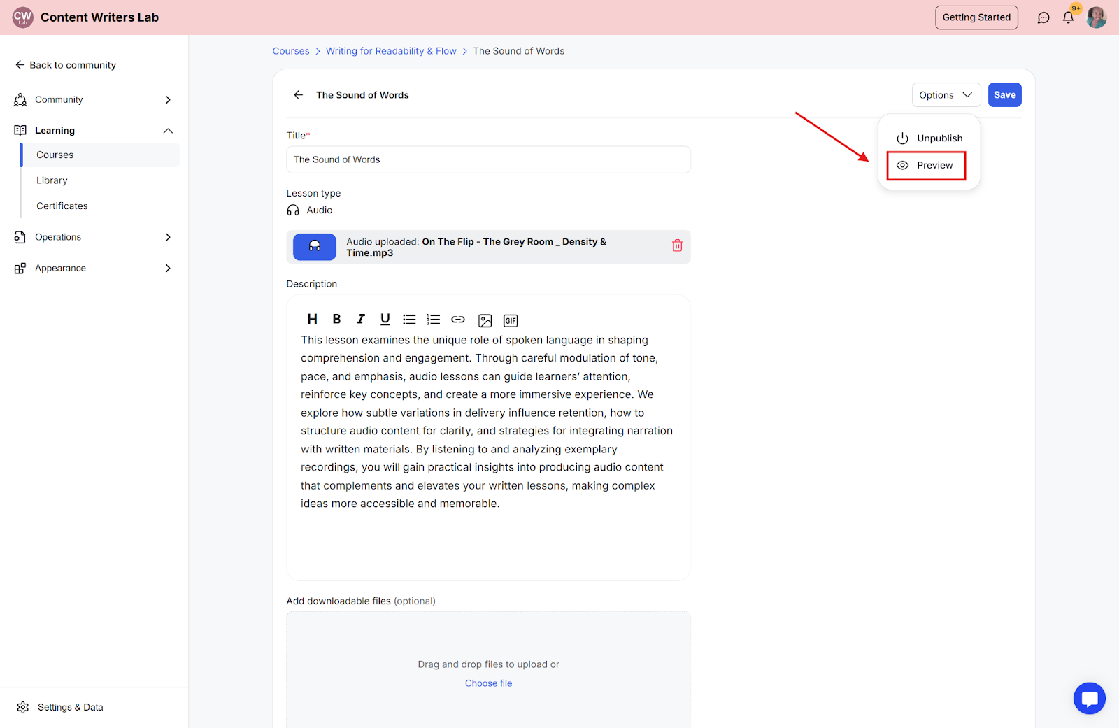 Step 5: To view and download the downloadable content on the course as a student would, click the options dropdown and select preview. This will allow you to see the content as a student would see it.