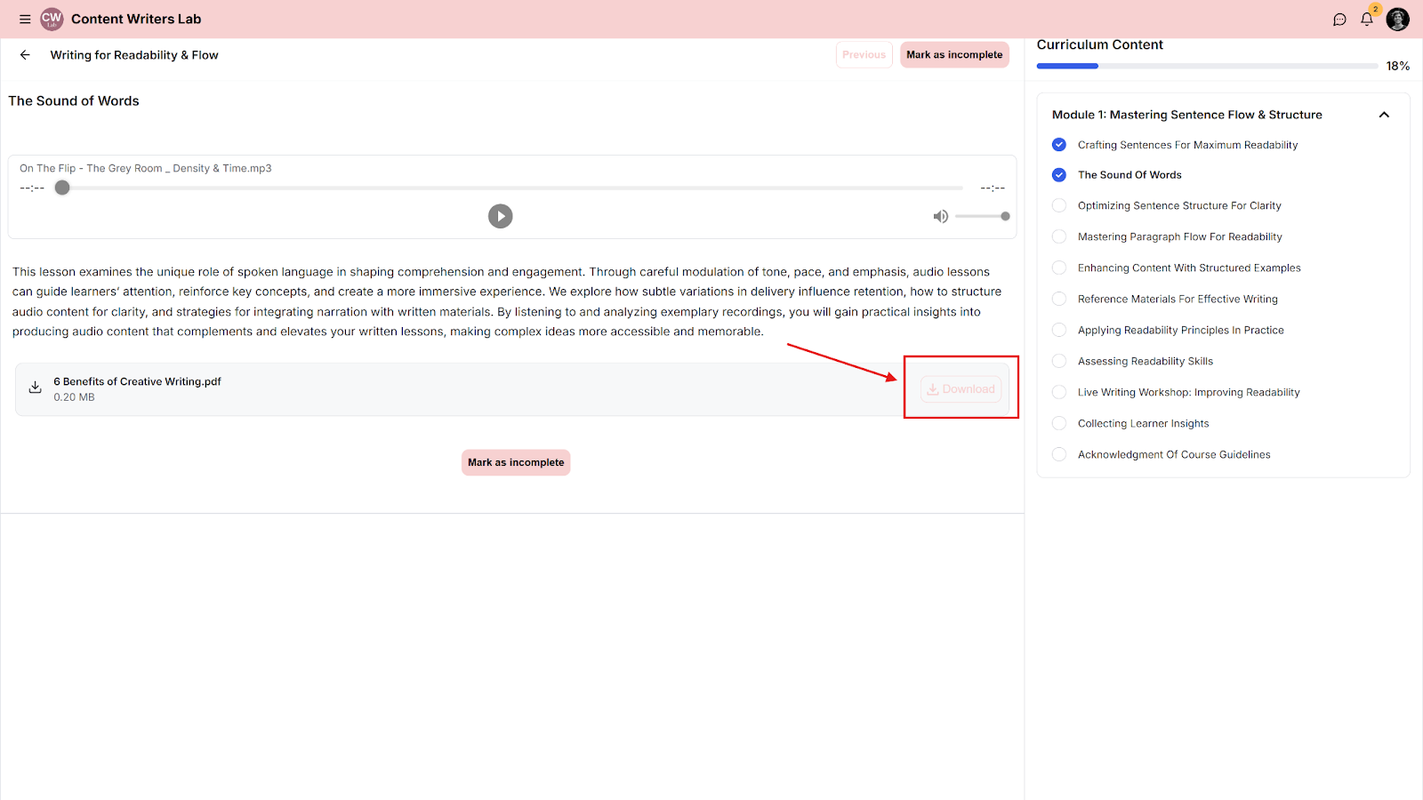 When creating a course lesson, you can include downloadable files to provide students with extra resources they can download and use offline.