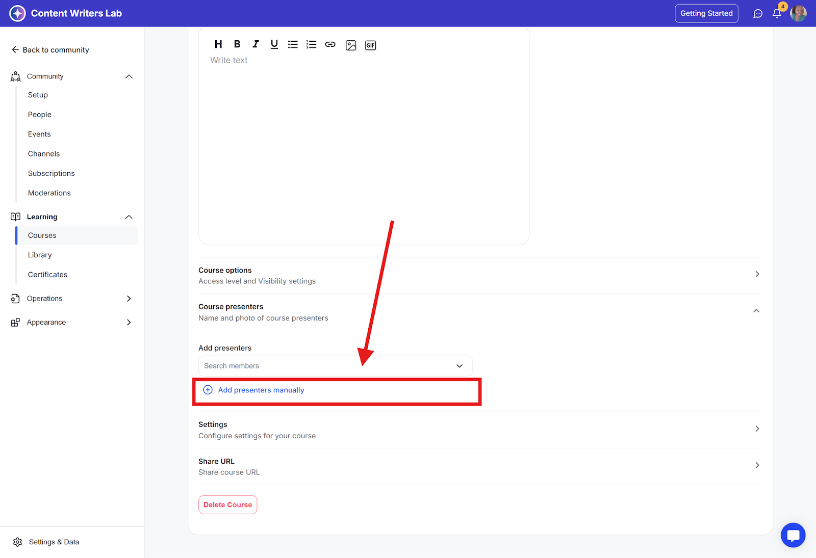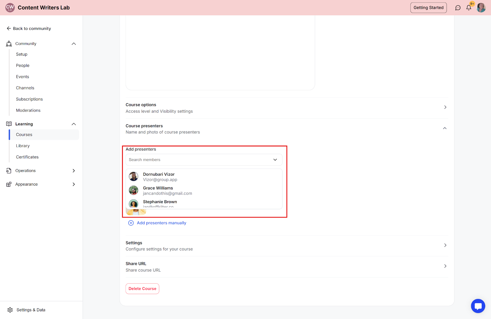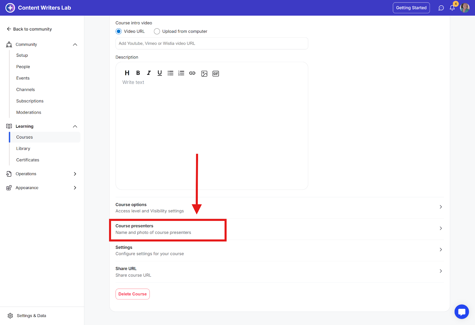 Step 2: On the side menu, click on Learning and select Courses. Then select the course you want to add presenters to.