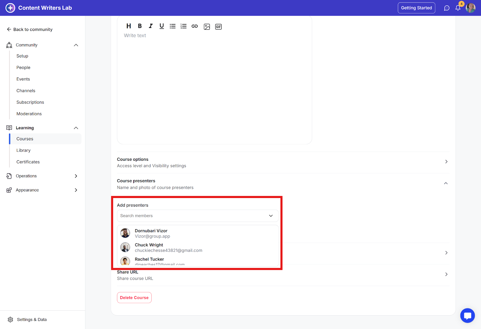 Step 1: Choose course instructors from your community members using the search field and add them to the course.
