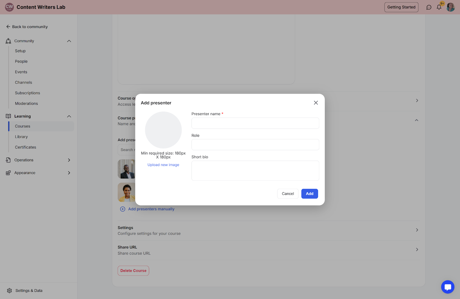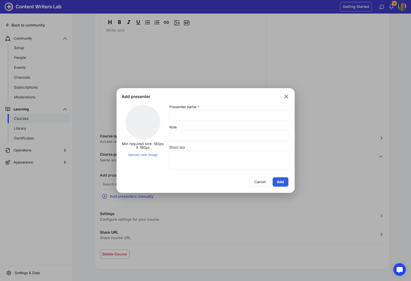 Step 2: In the pop-up, enter the instructor’s name, bio, and role, and upload an image. Then, click Add to finish.