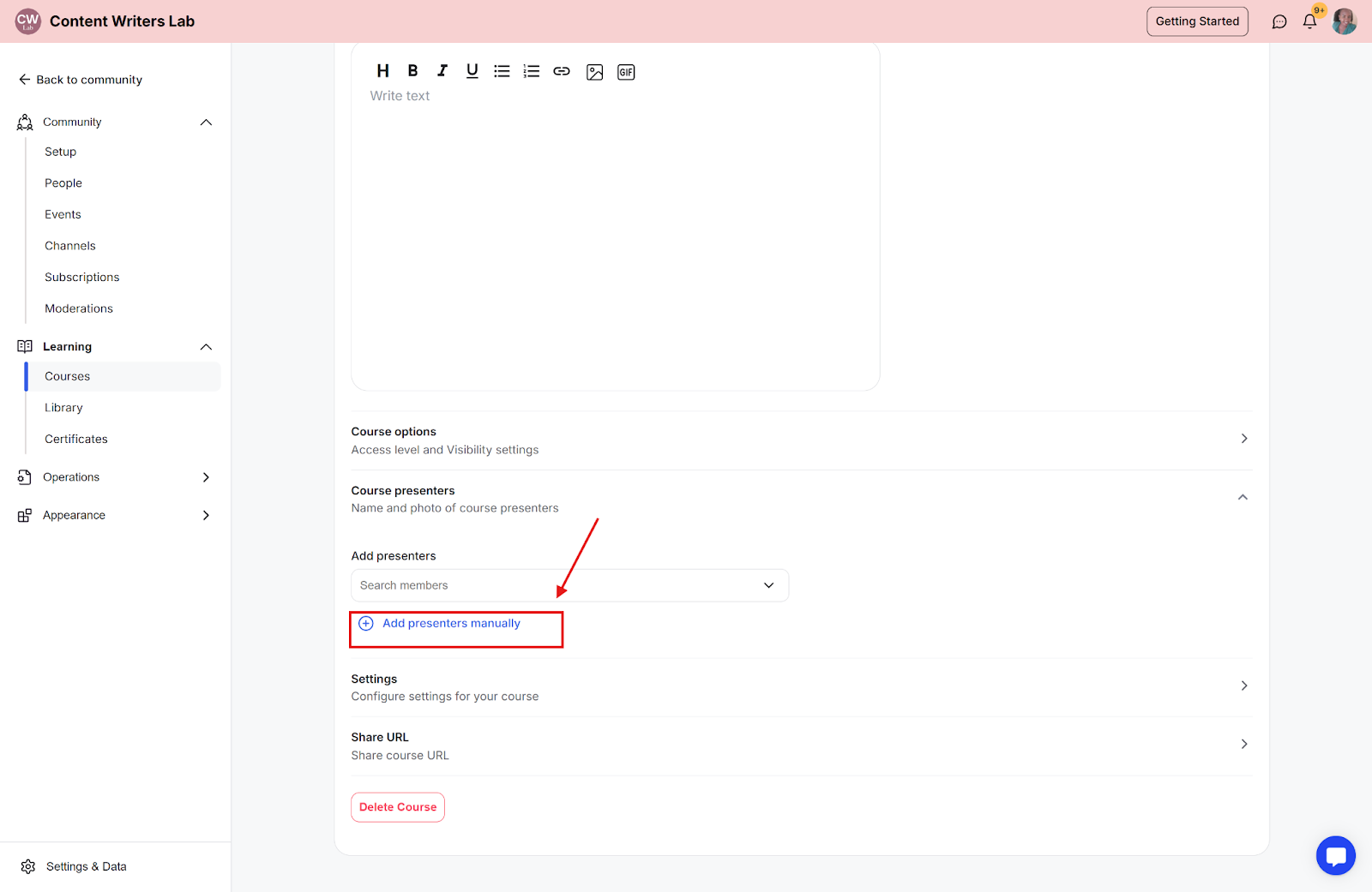Step 4: Scroll down to the Course Presenters section.