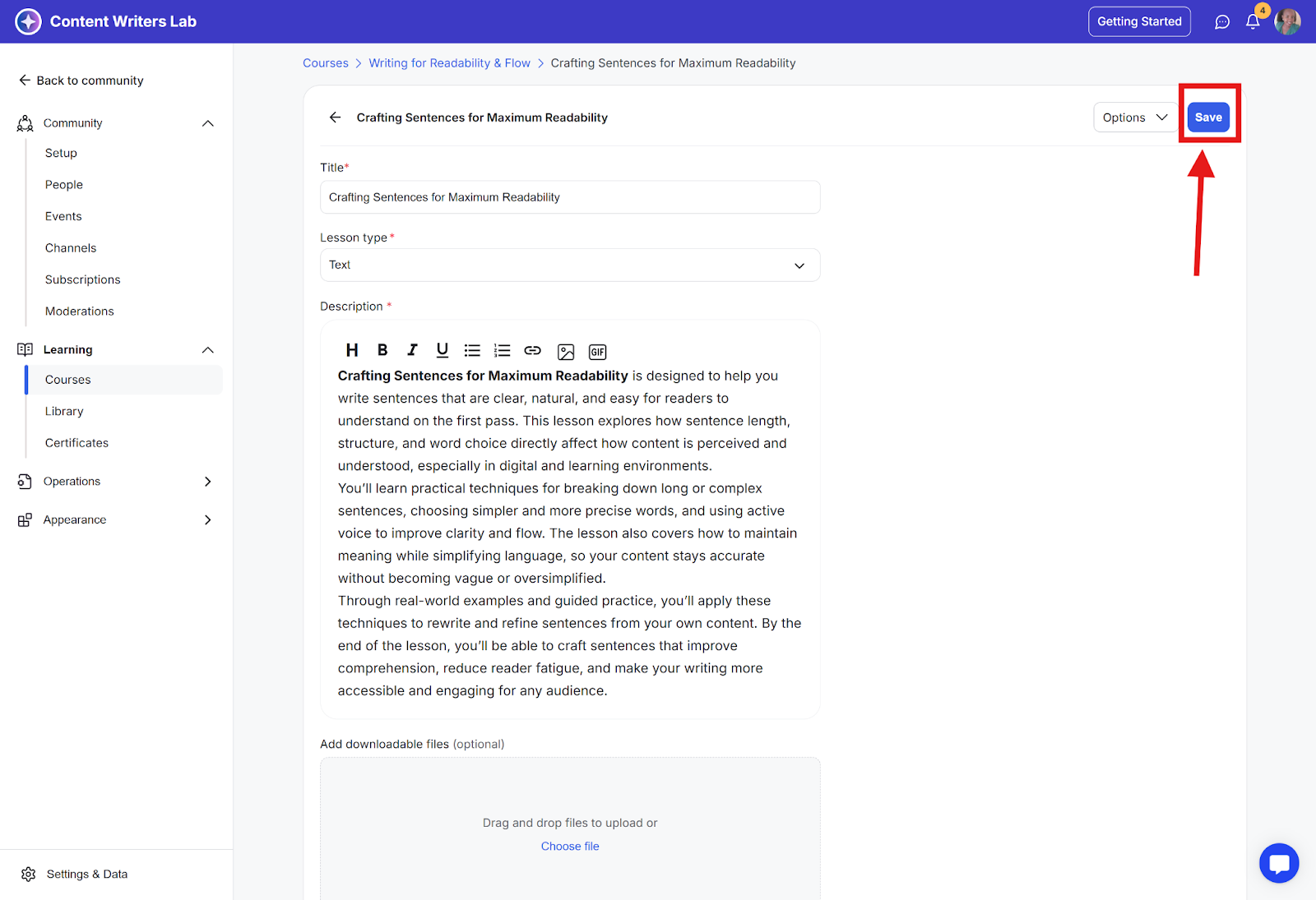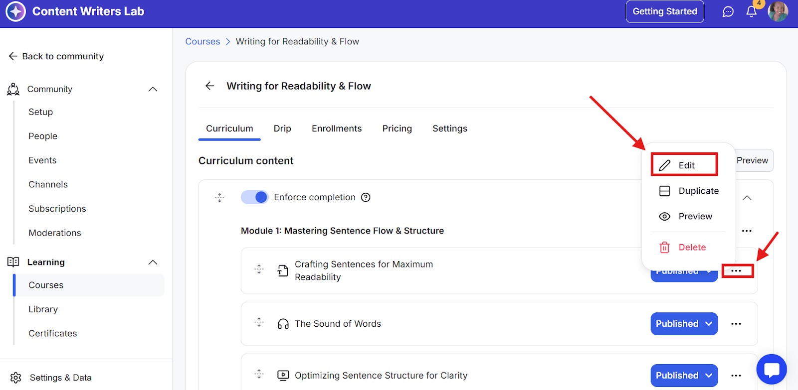 Step 2: On the side menu, click on Learning, and select Courses. Then click on the course in which you want to lock lessons.