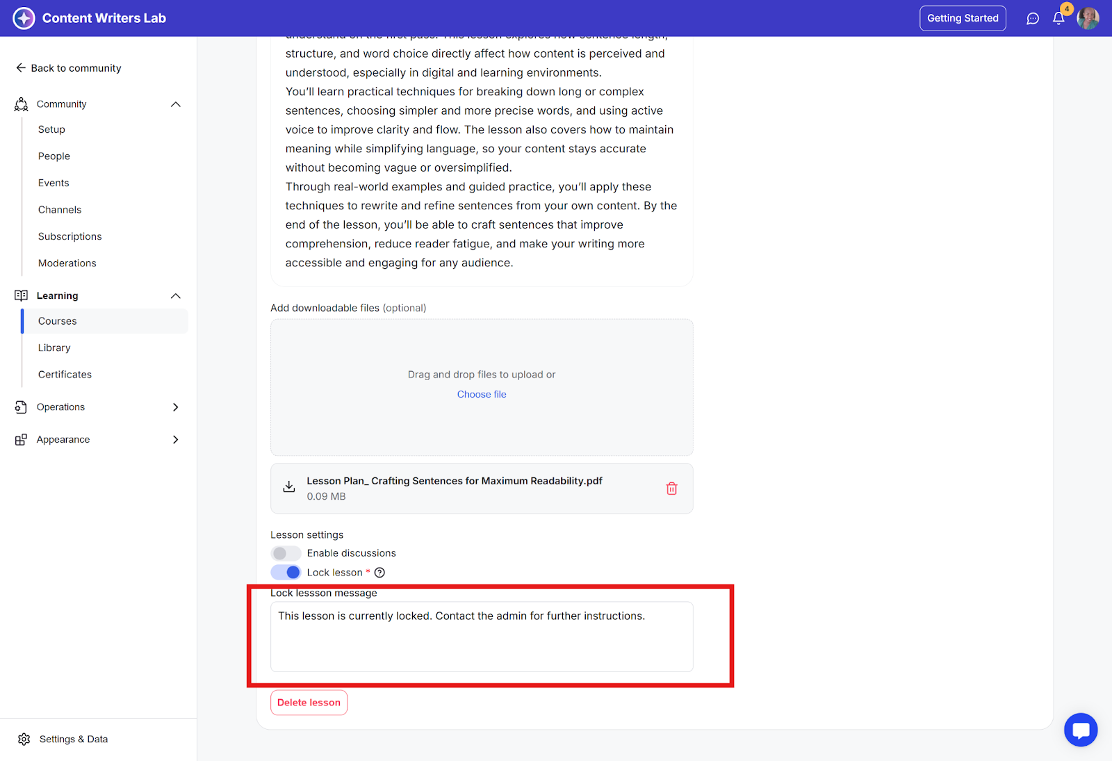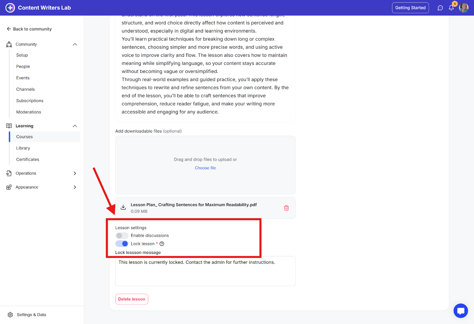 Step 5: Scroll down the page to Lesson Settings and toggle on Lock Lesson.