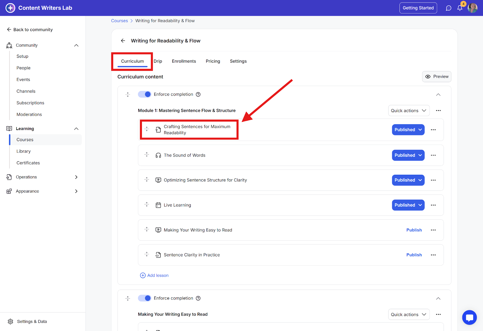 Step 3: On the Curriculum tab, select the lesson you want to edit.