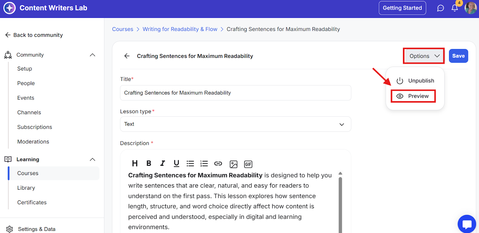 Step 8: To view the lock message on the course, click on the Options and select Preview from the drop-down.