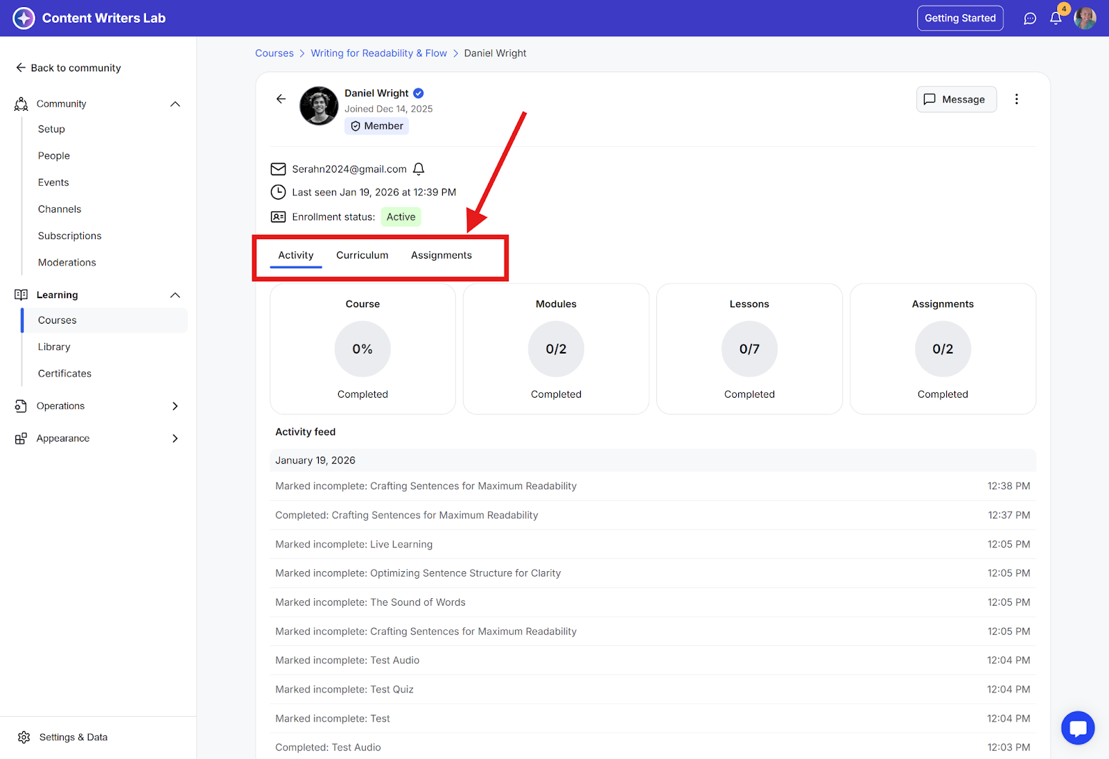 Activity: See a timeline of their interactions and completions.
