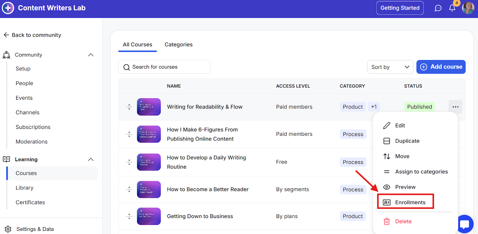 Step 4: Click the three-dot menu next to that course and select Enrollments.