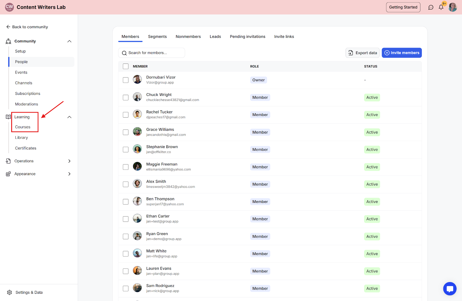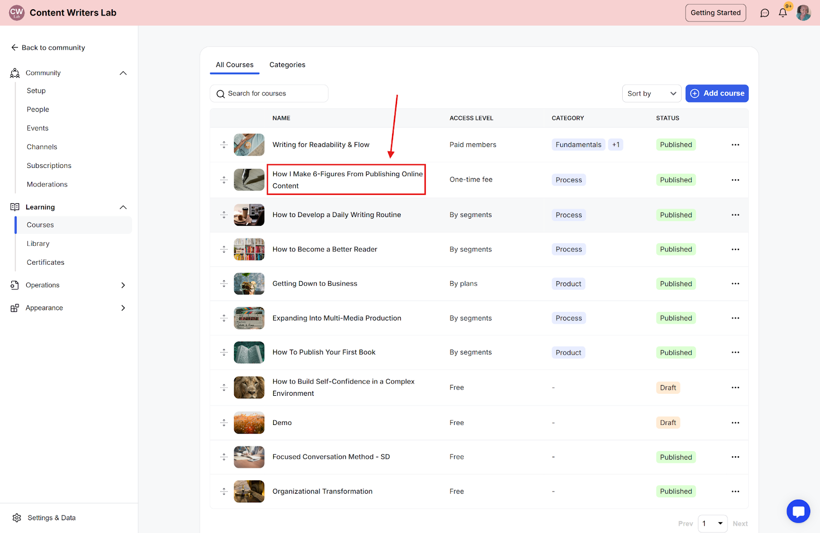 Step 2: Go to Learning in the side menu and select Courses.