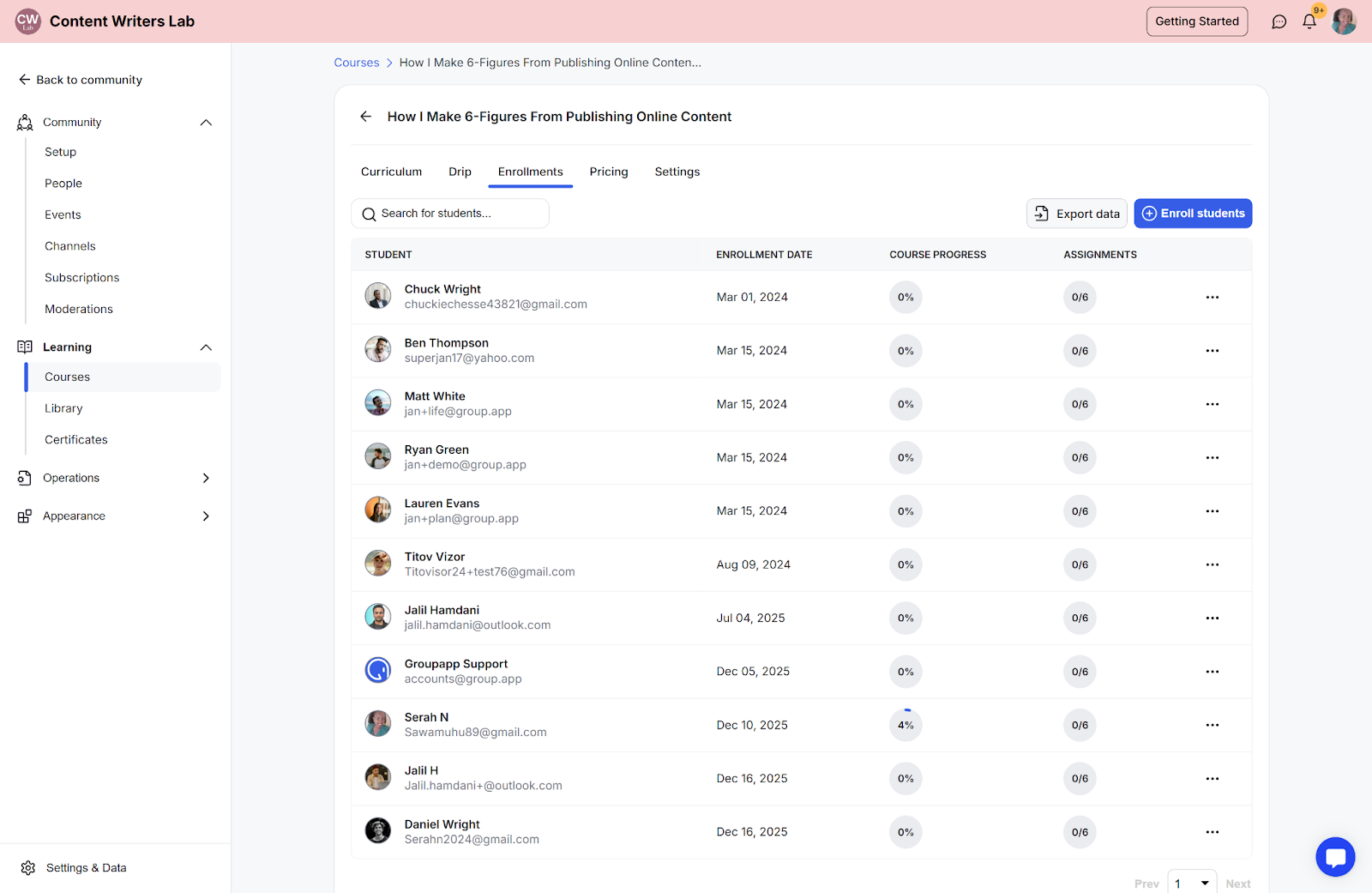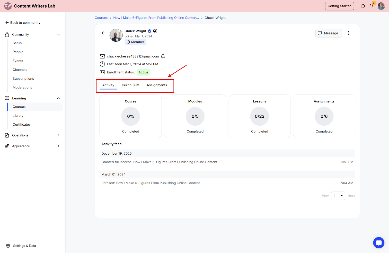 Curriculum: View their progress through each course section and lesson, including the number of modules and lessons they have completed.