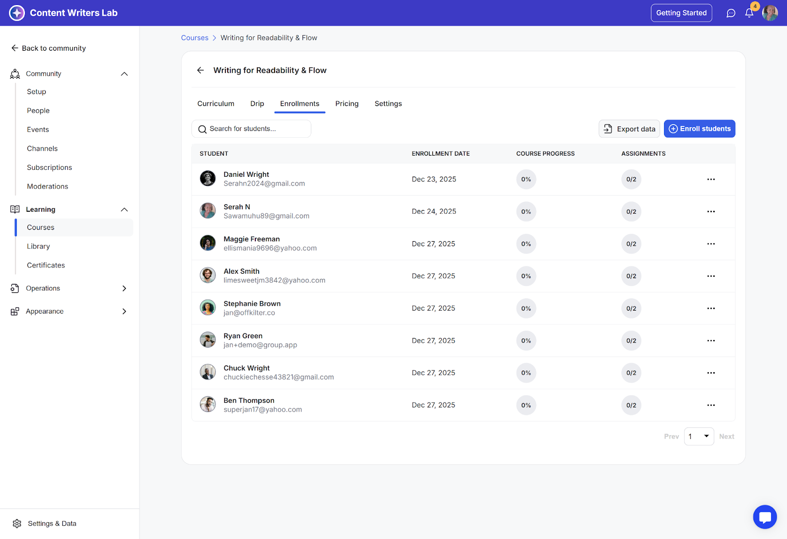 You can easily monitor student enrollments and track their progress directly within GroupApp. This guide will show you how to access detailed reports for both overall course engagement and individual student activity.