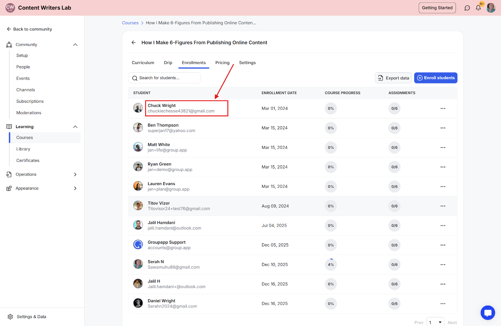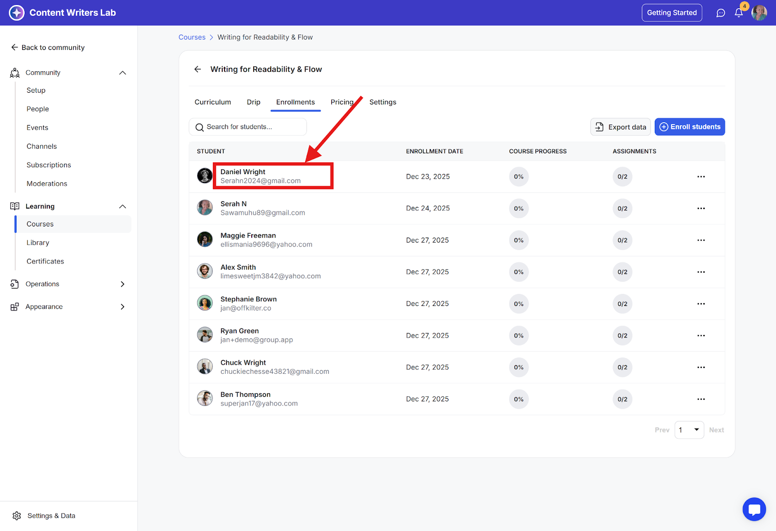 Step 5: You will now see a list of all students enrolled in the course, displaying their: