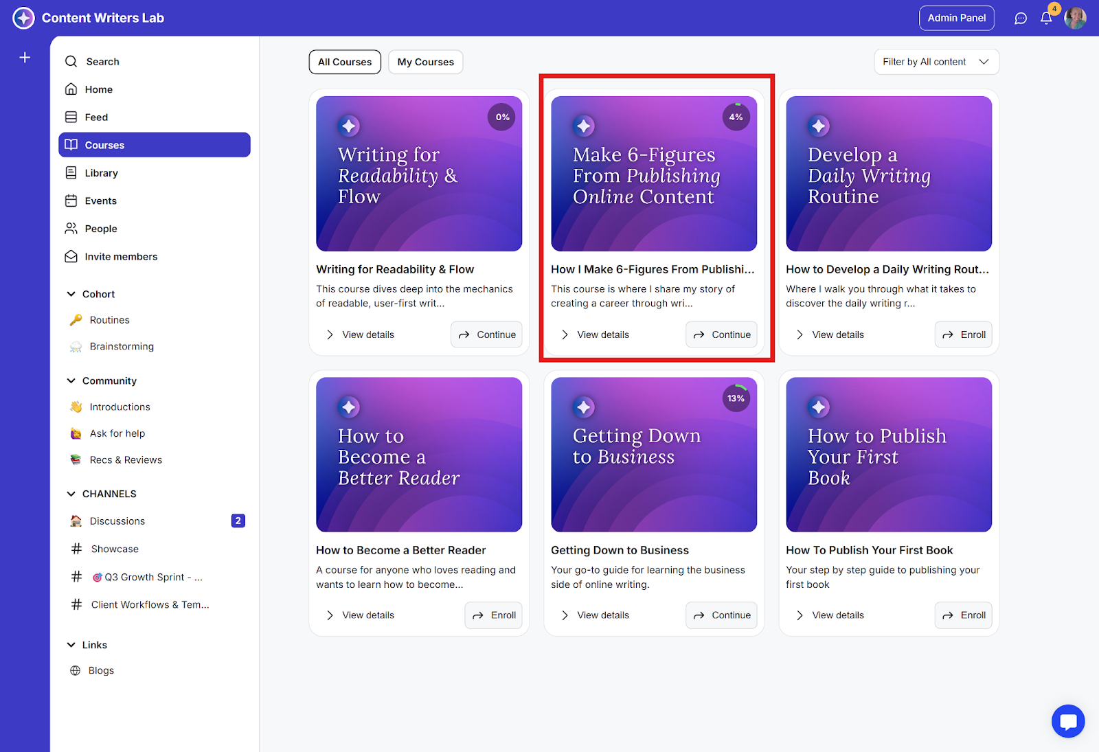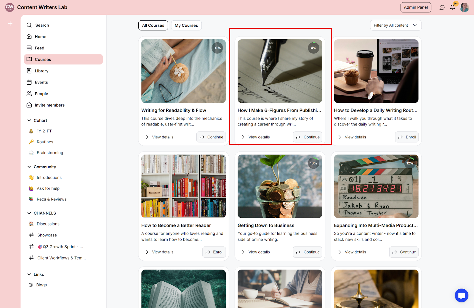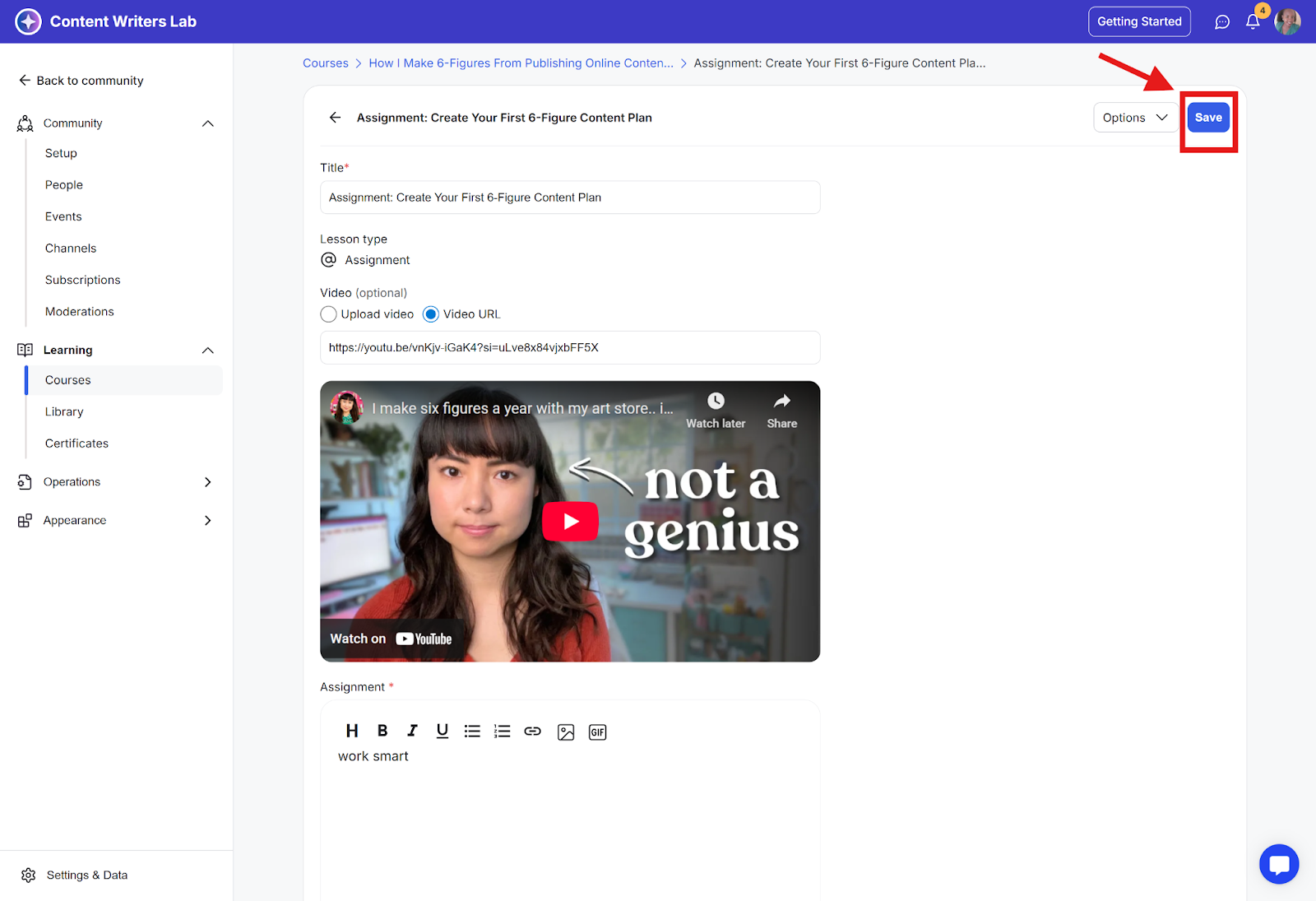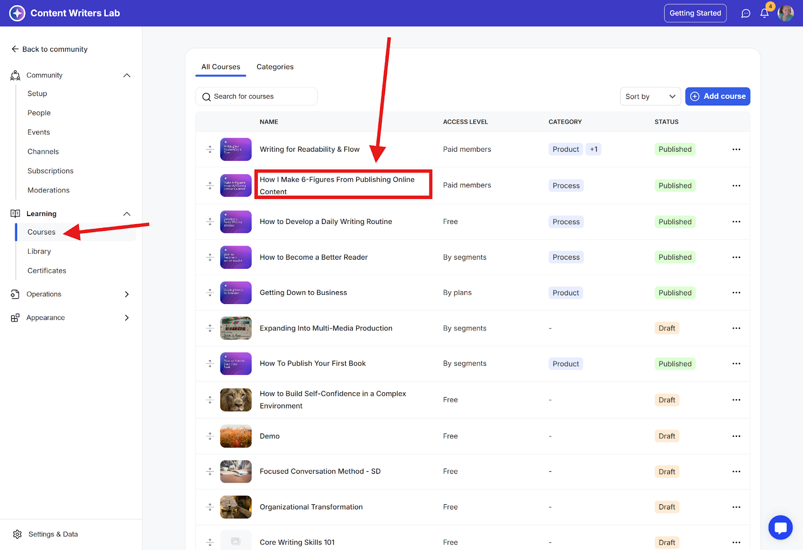 Step 2: Go to Learning and select Courses. Then select the course you have an assignment lesson on.