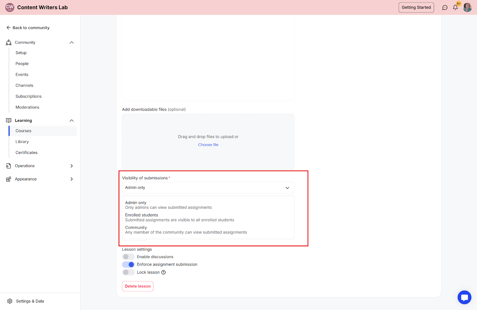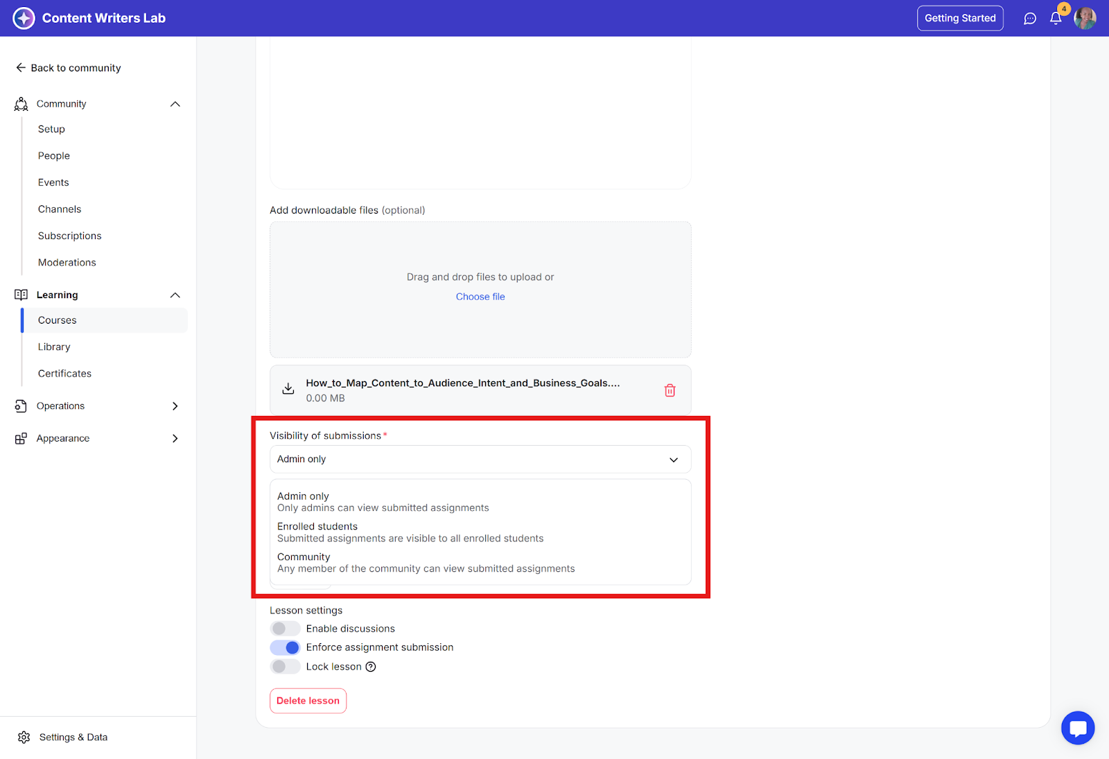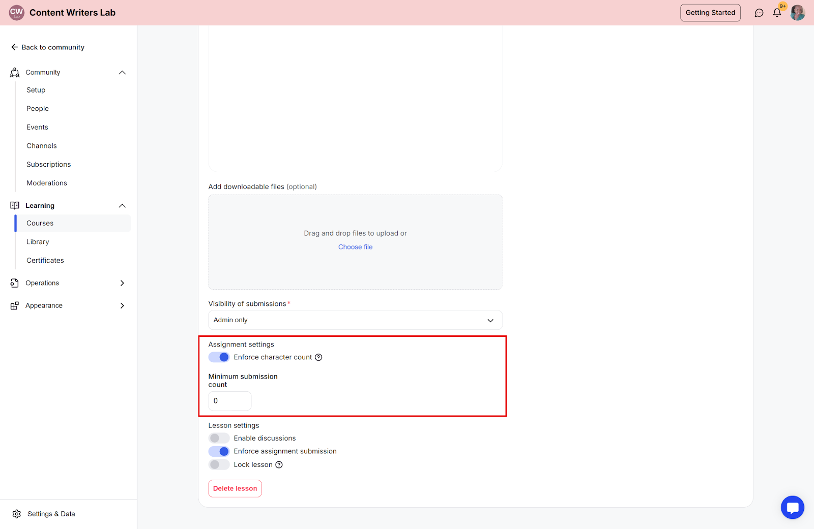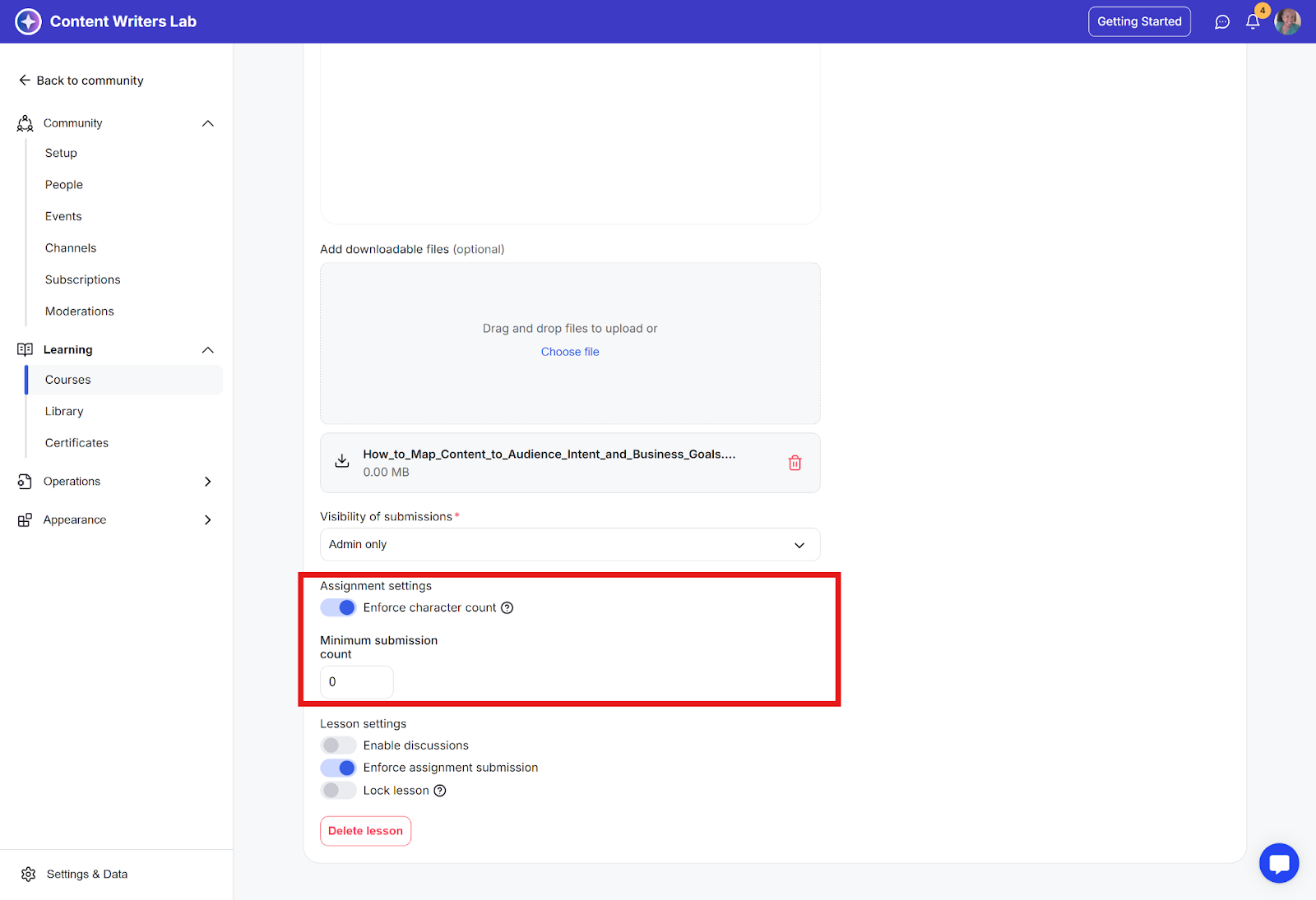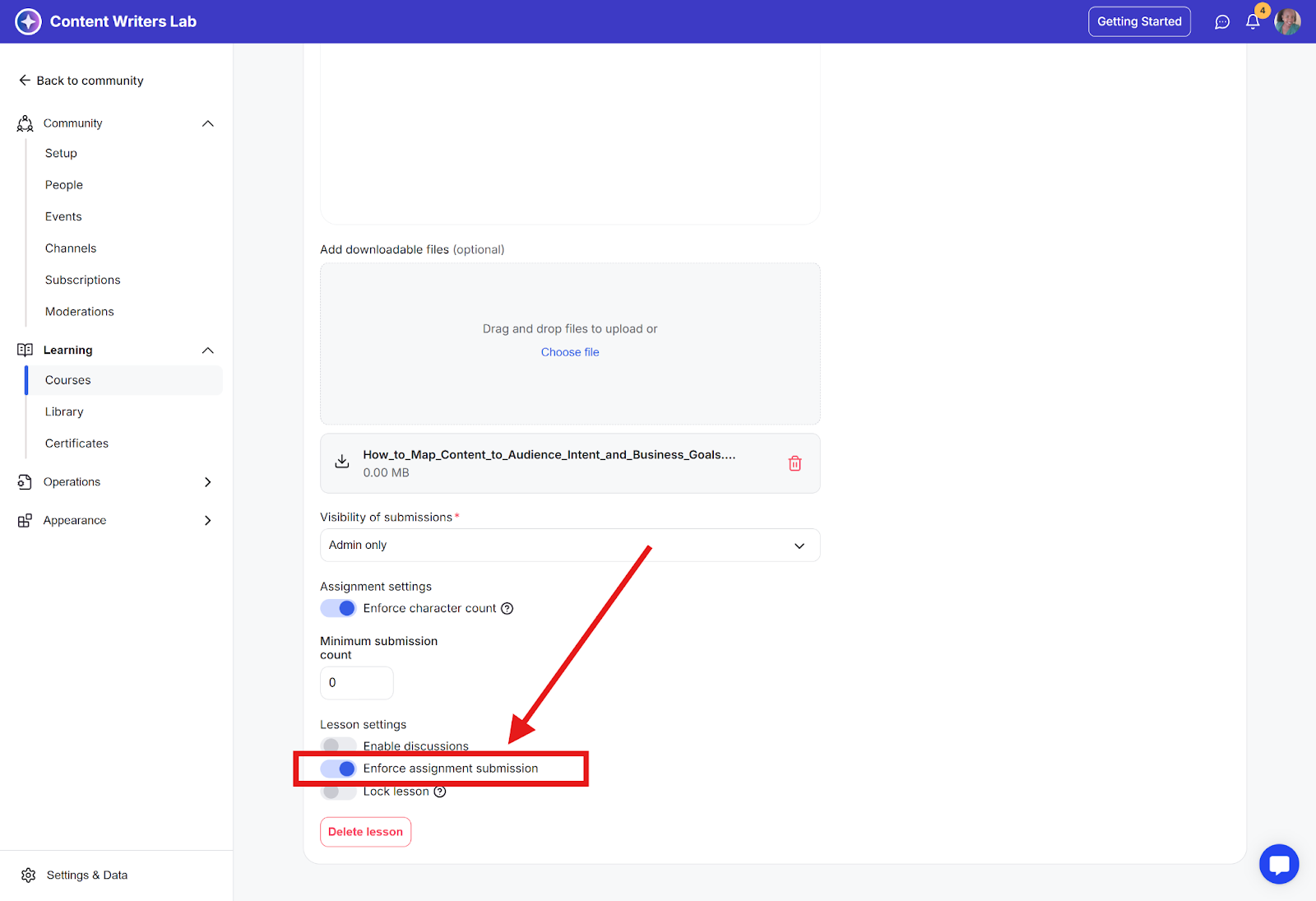 Step 6: Scroll down to the Lesson Settings section. There, toggle Enforce Assignment Submission to on. This requires students to submit the assignment before they can proceed to the next lesson.