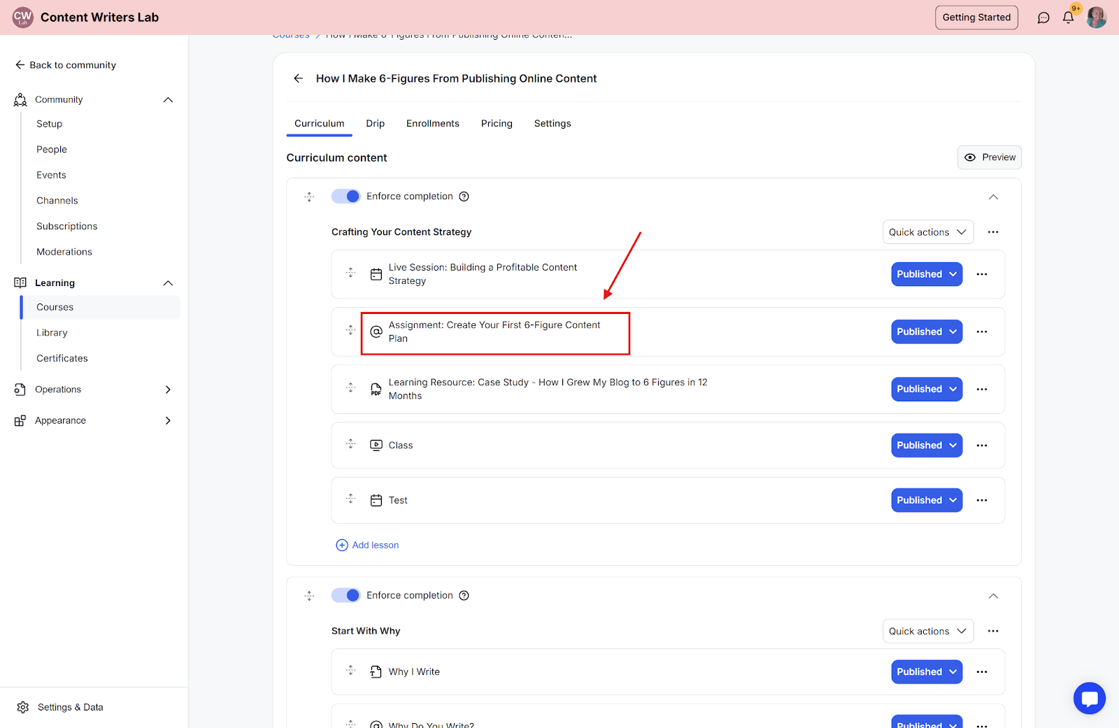 Step 3: On the Curriculum tab, select the assignment lesson you want to edit.