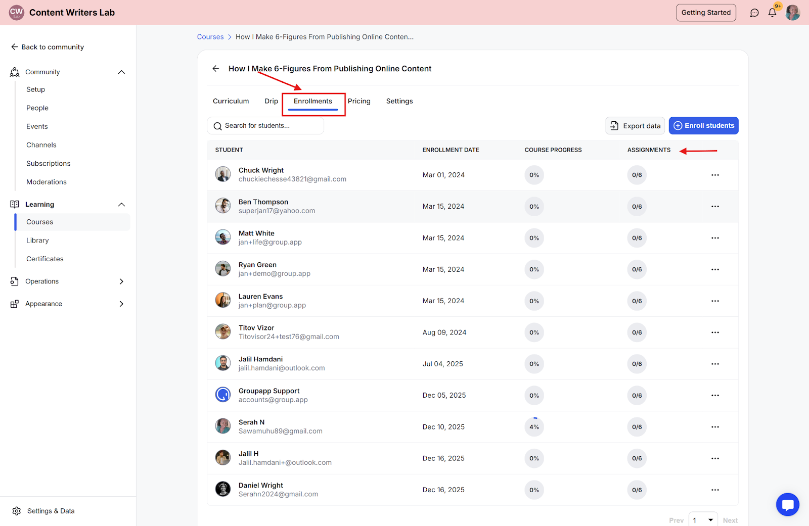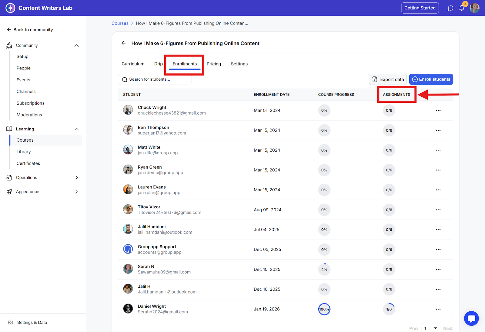 Go to your course’s Enrollments tab and click on a student’s Assignment progress bar to view their submitted work.