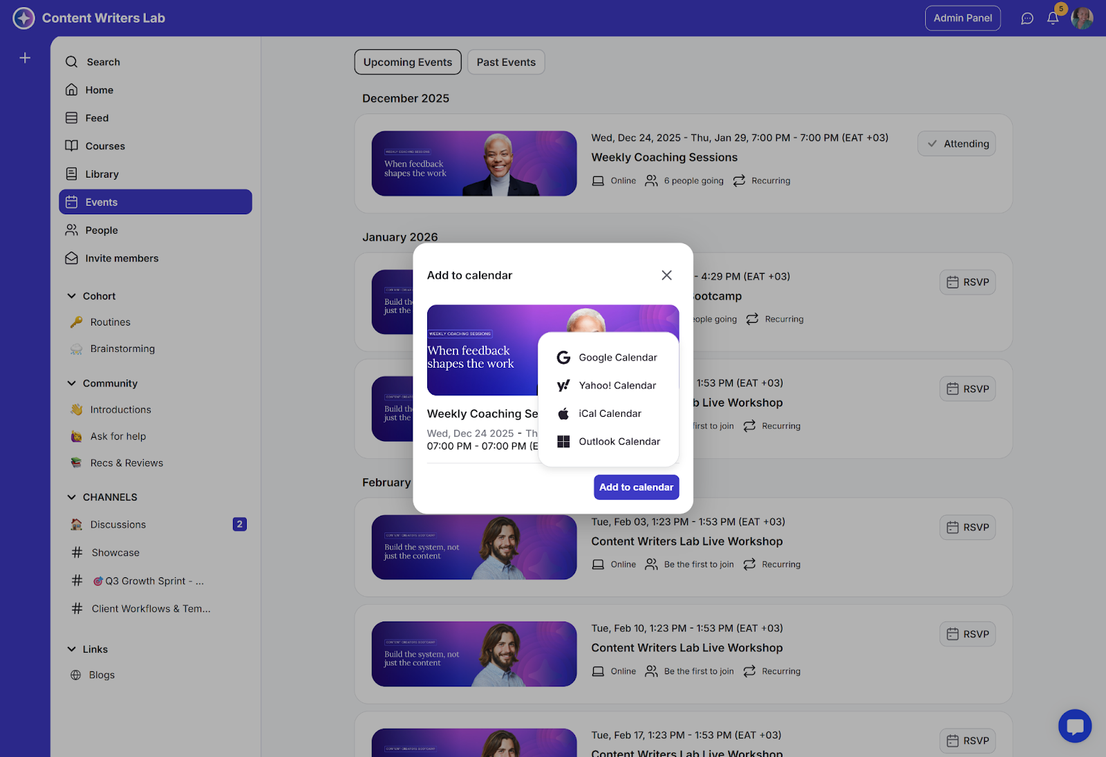 When members RSVP for an event, they can add community event reminders to the following calendar apps: