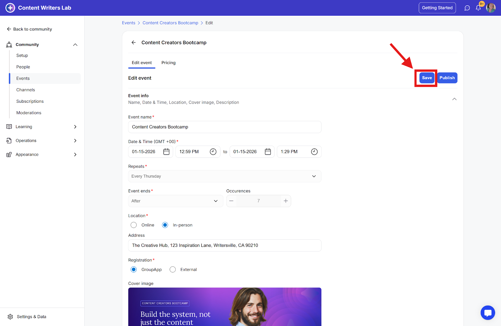Step 8: Go back to the Edit Event tab and click Publish to make the event go live.