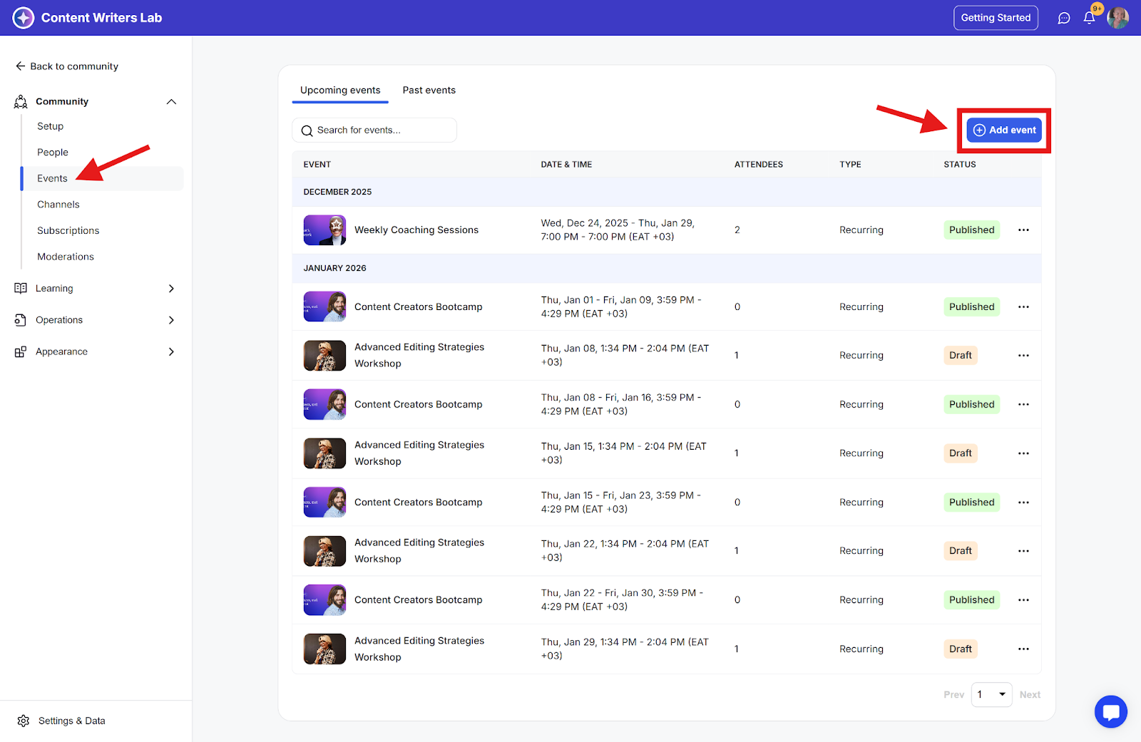 Step 2: Click on Events in the admin panel and then click on the Add Event button in the top right corner.