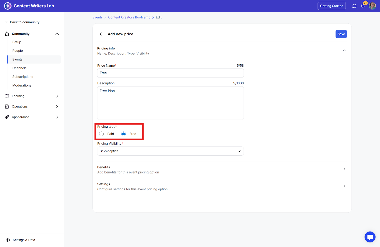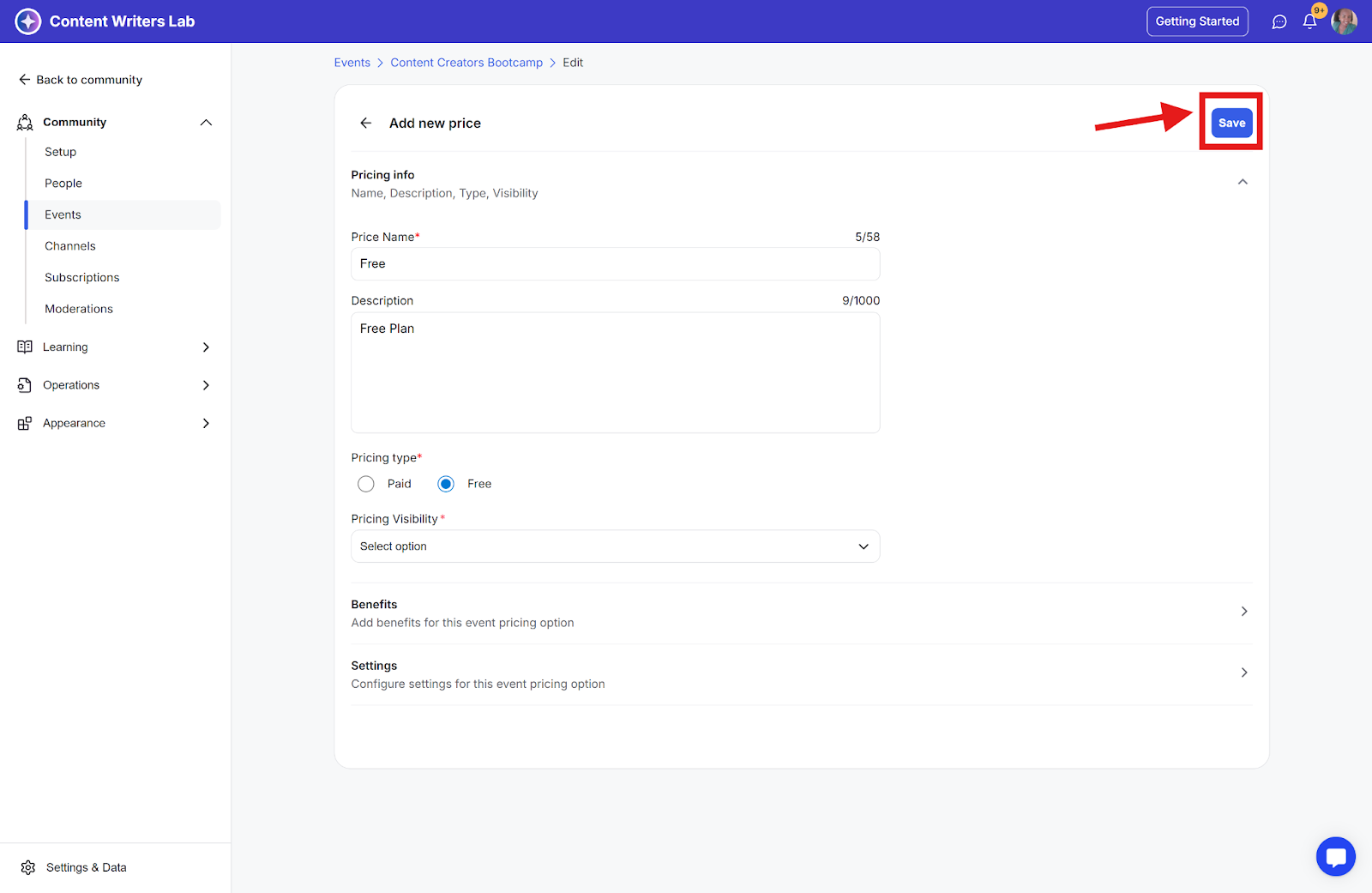 Step 6: Navigate to the Pricing tab and create a free pricing option.