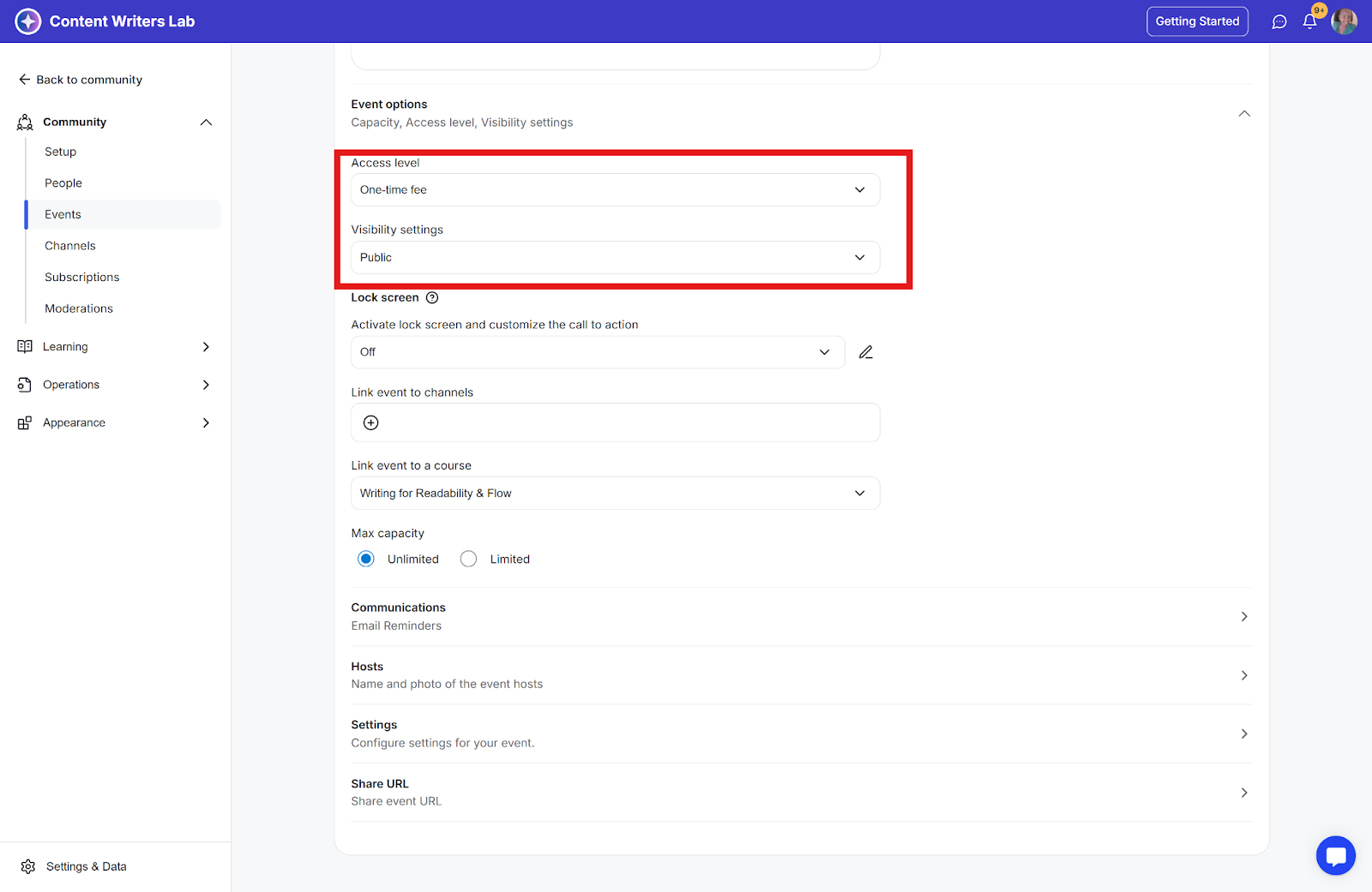Step 4: On the event builder, scroll down to the Event Options section. Set the access level to One-time fee, and visibility to Public.
