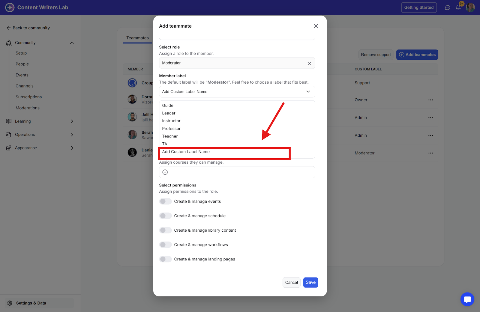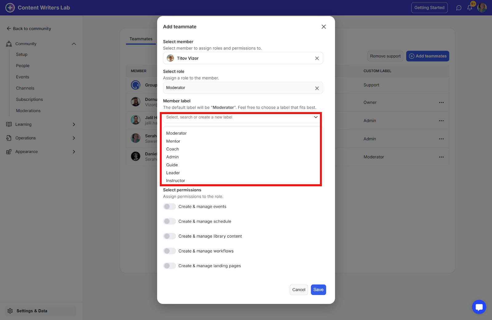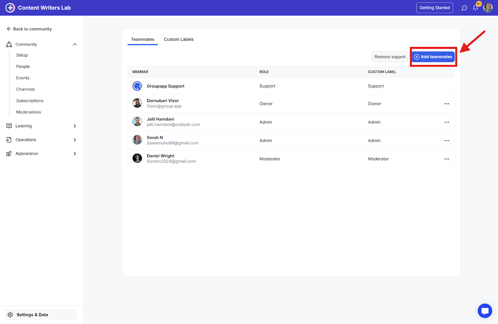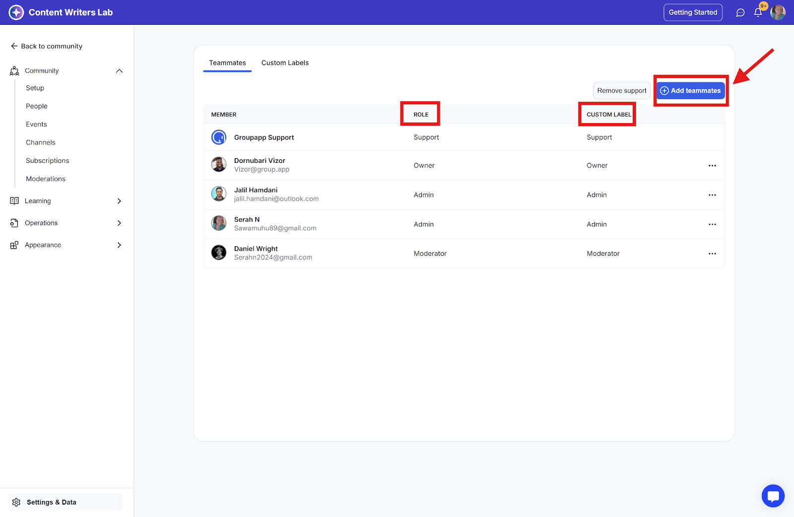 Here, you'll find an option to add community members as teammates, along with a list of all current teammates. The custom role labels will be displayed as badges on their profiles, making it easy for others to see their assigned custom roles within the community.
