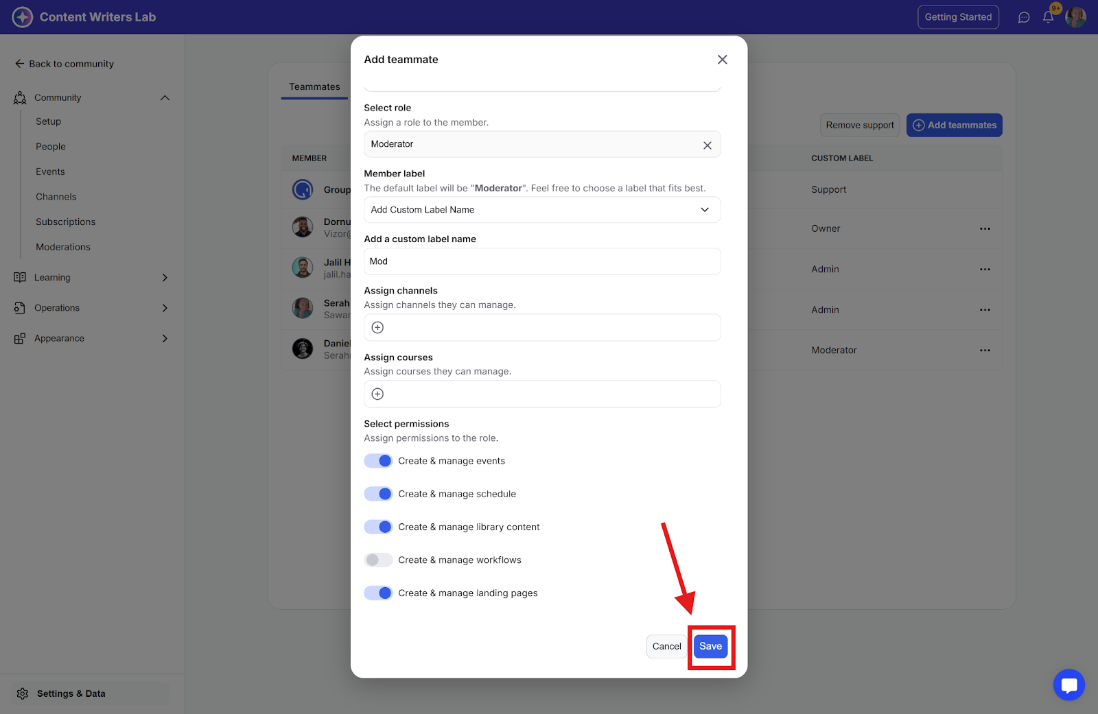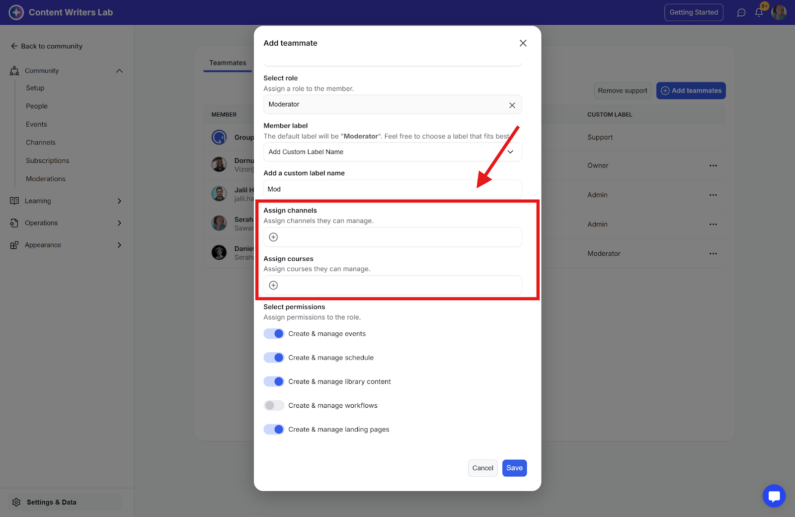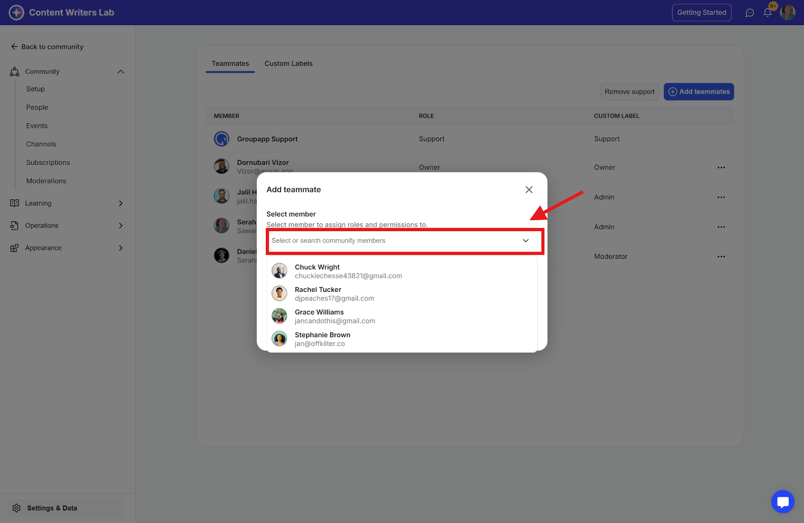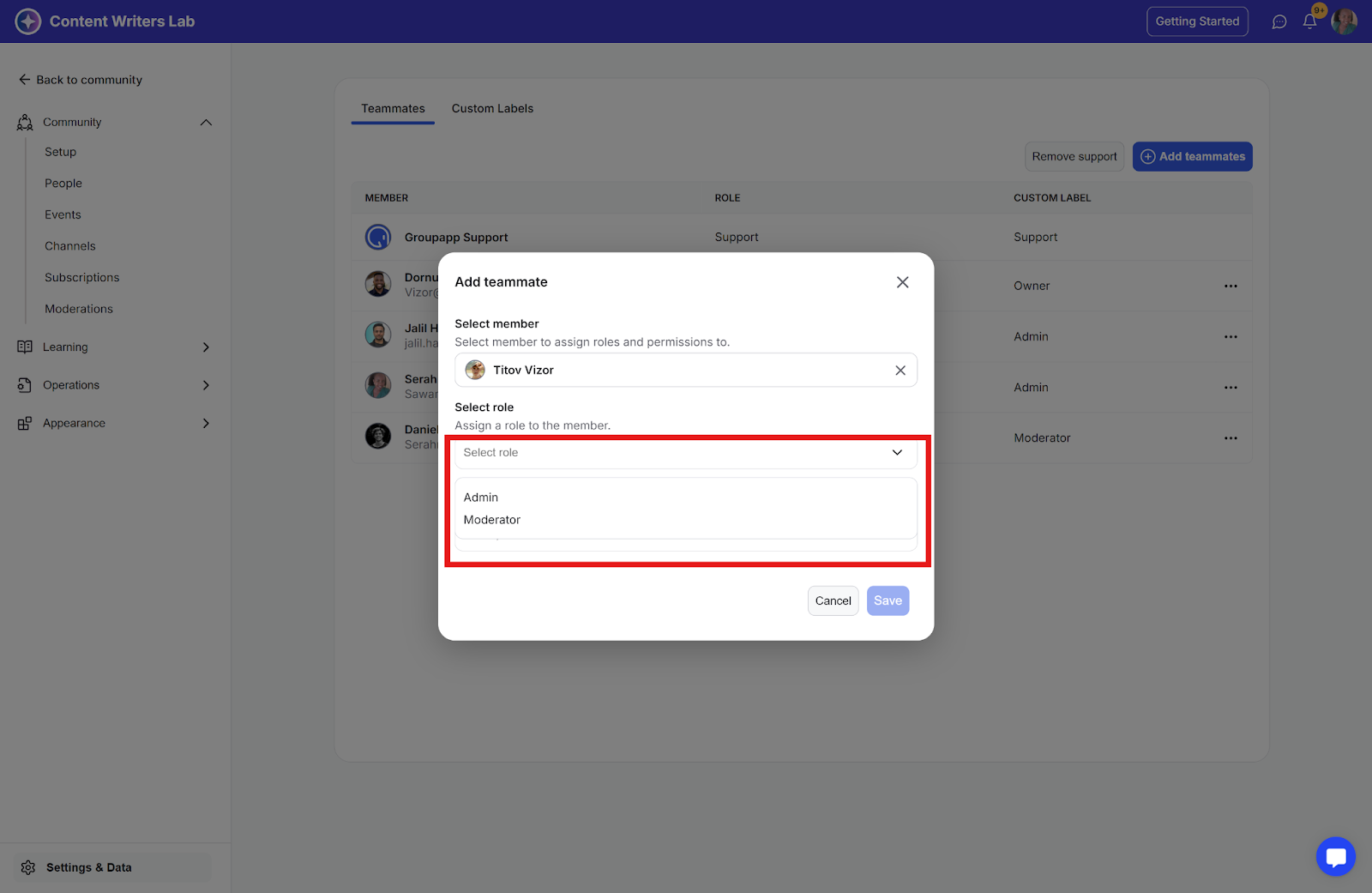 Here, you'll find an option to add community members as teammates, along with a list of all current teammates. The custom role labels will be displayed as badges on their profiles, making it easy for others to see their assigned custom roles within the community.