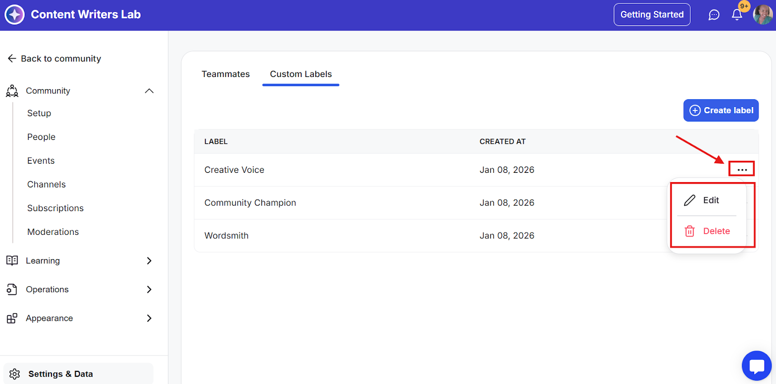 Step 3: You can edit or delete a custom role label by clicking the three-dot menu in the column.
