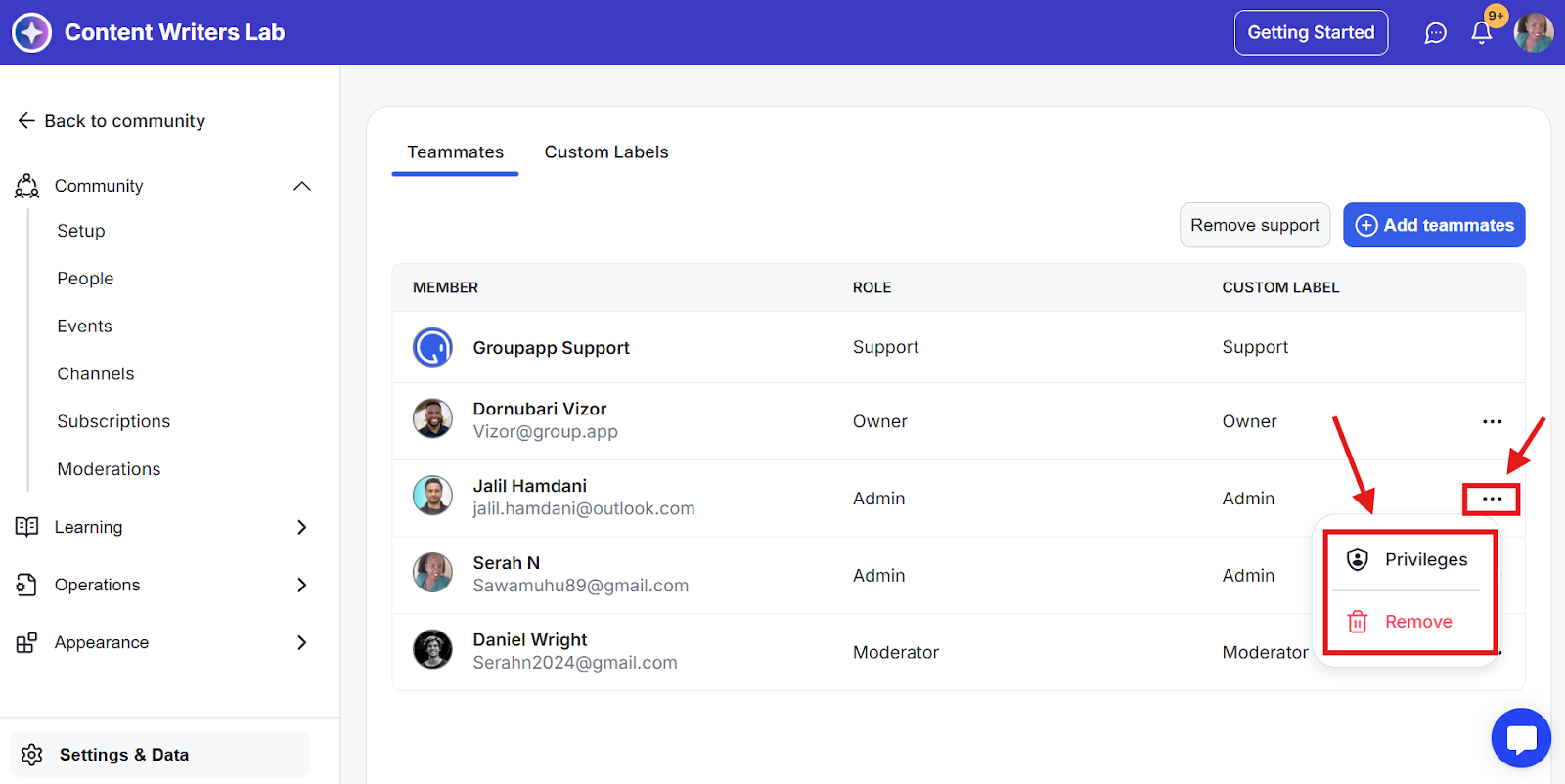 Step 9: You can remove or edit the privileges of an existing teammate by clicking the three-dot option.