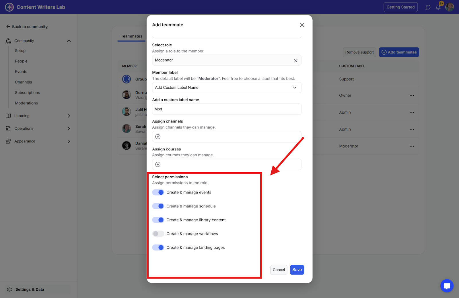 Step 7: When granted the following permissions, moderators will have unrestricted access, enabling them to perform all admin-level actions across community events, scheduled content, library content, workflows, and landing pages.
