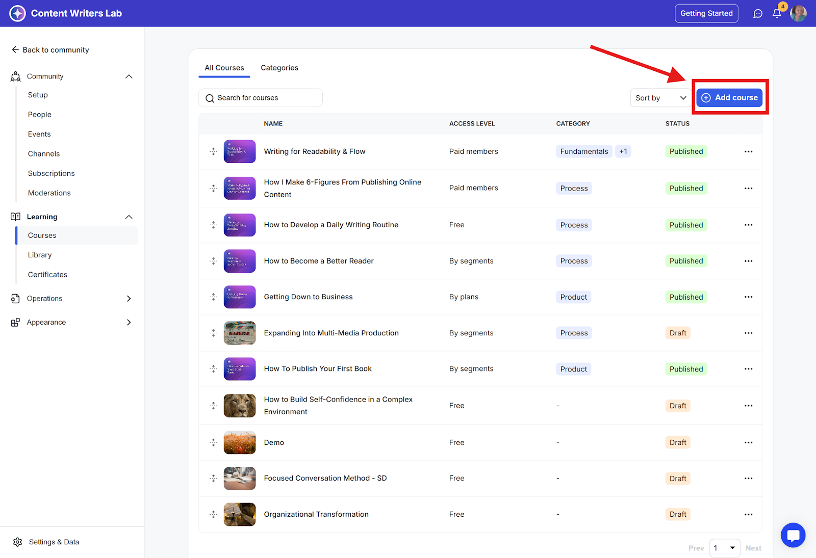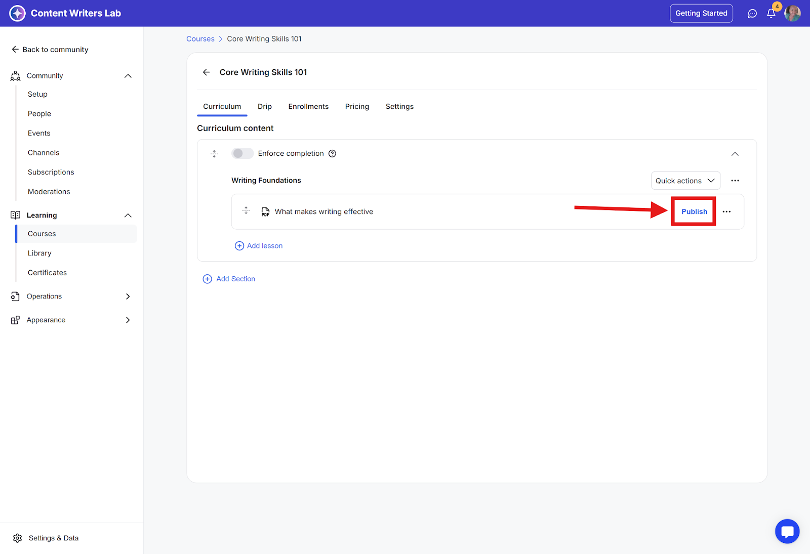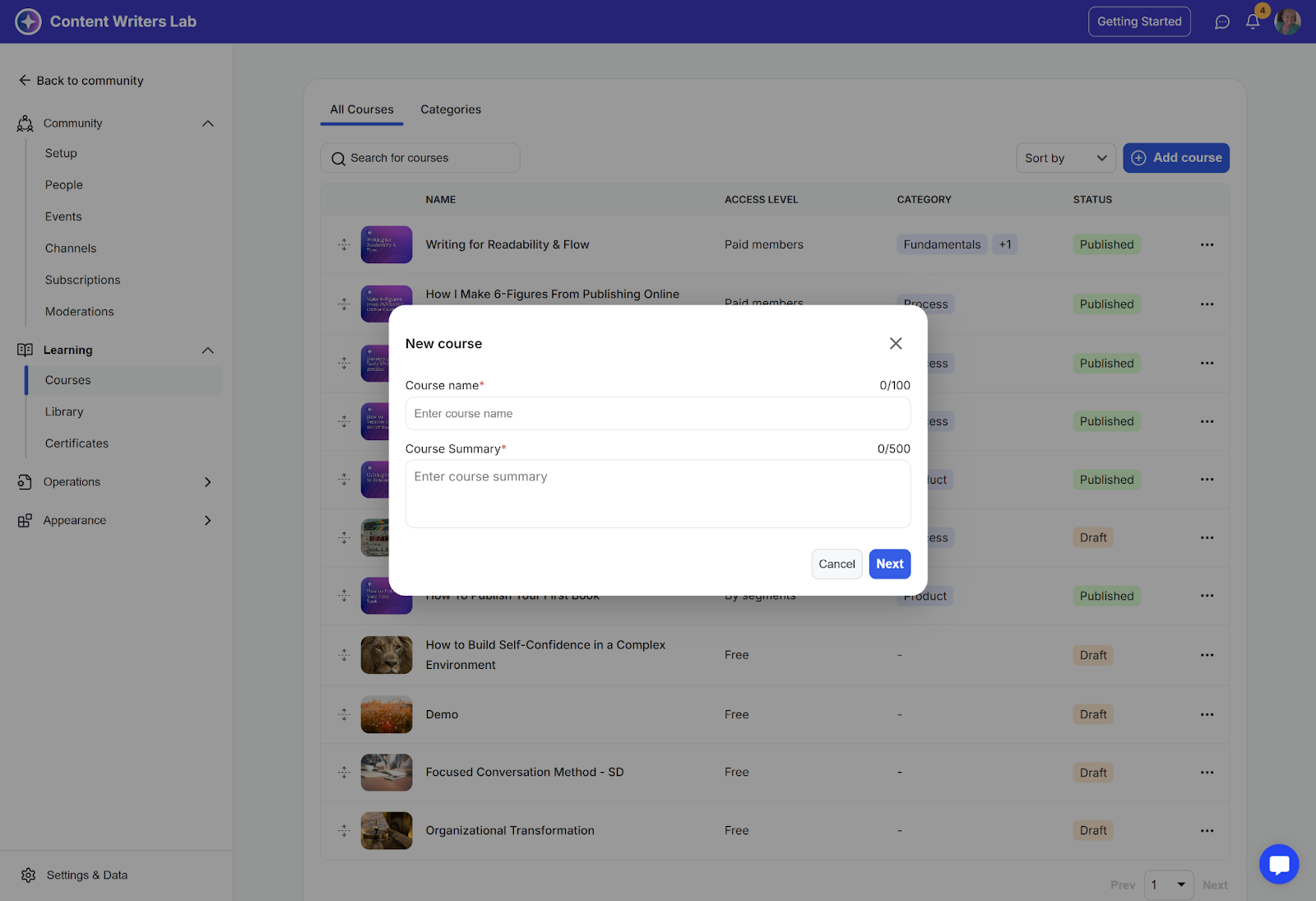 Step 5: The Next button will take you to the Course Builder. From there, you can add course sections and lessons to the curriculum, edit various configurations in the settings tab, and more.