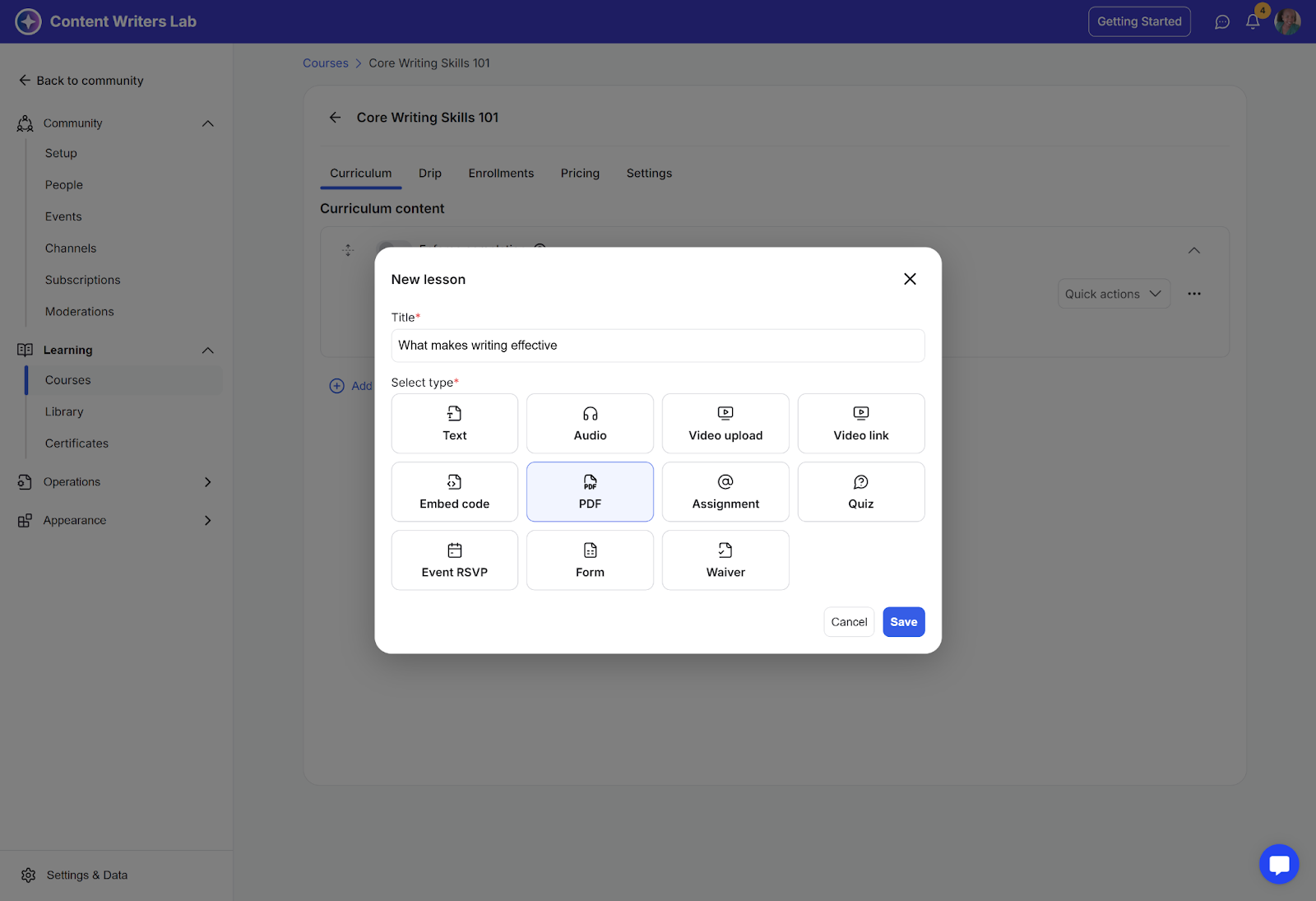 Step 9: Enter the lesson Title, choose the Type, and click Save.
