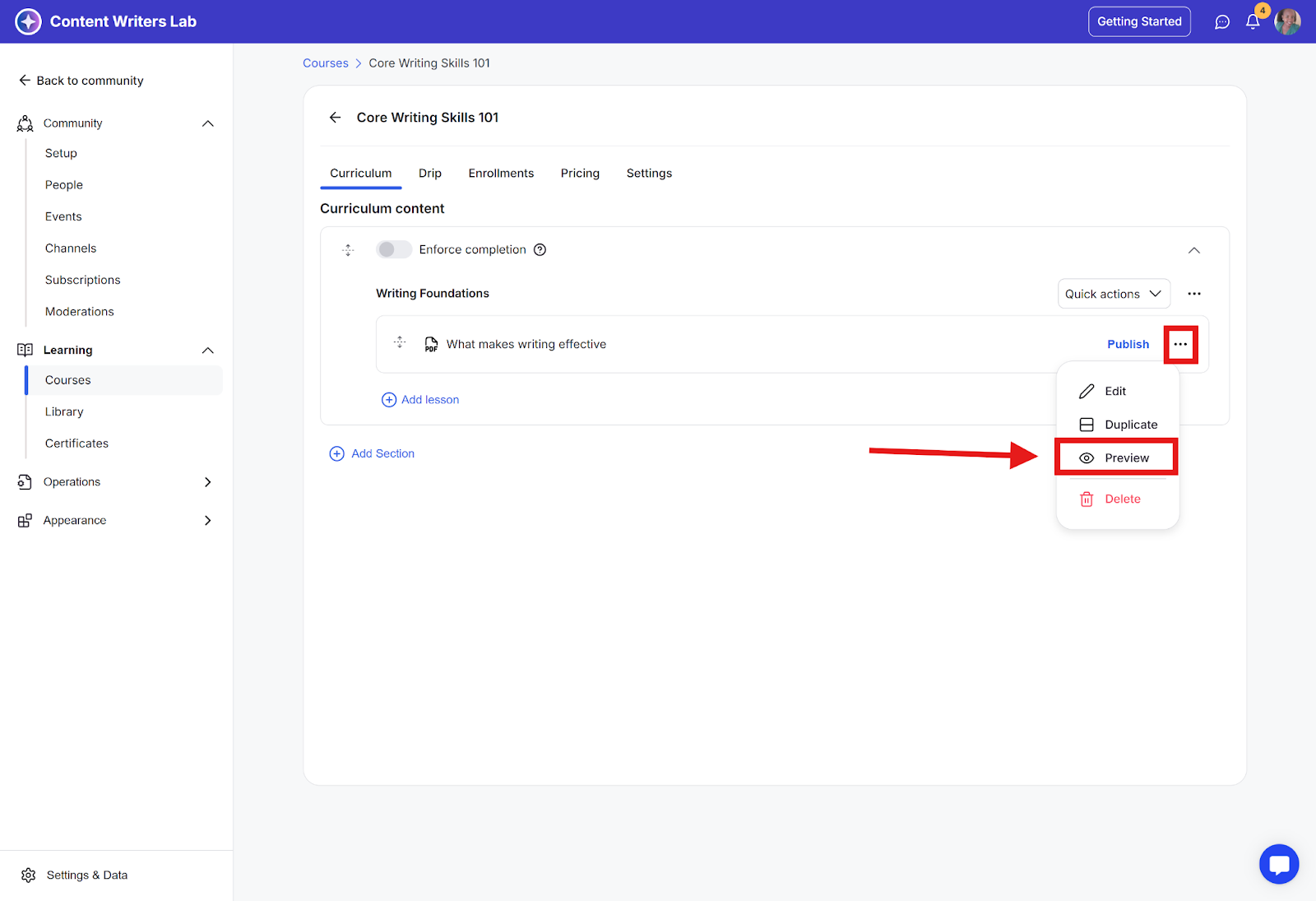 Step 10: To preview how the lesson will appear to a student, click the three-dot icon and select Preview.