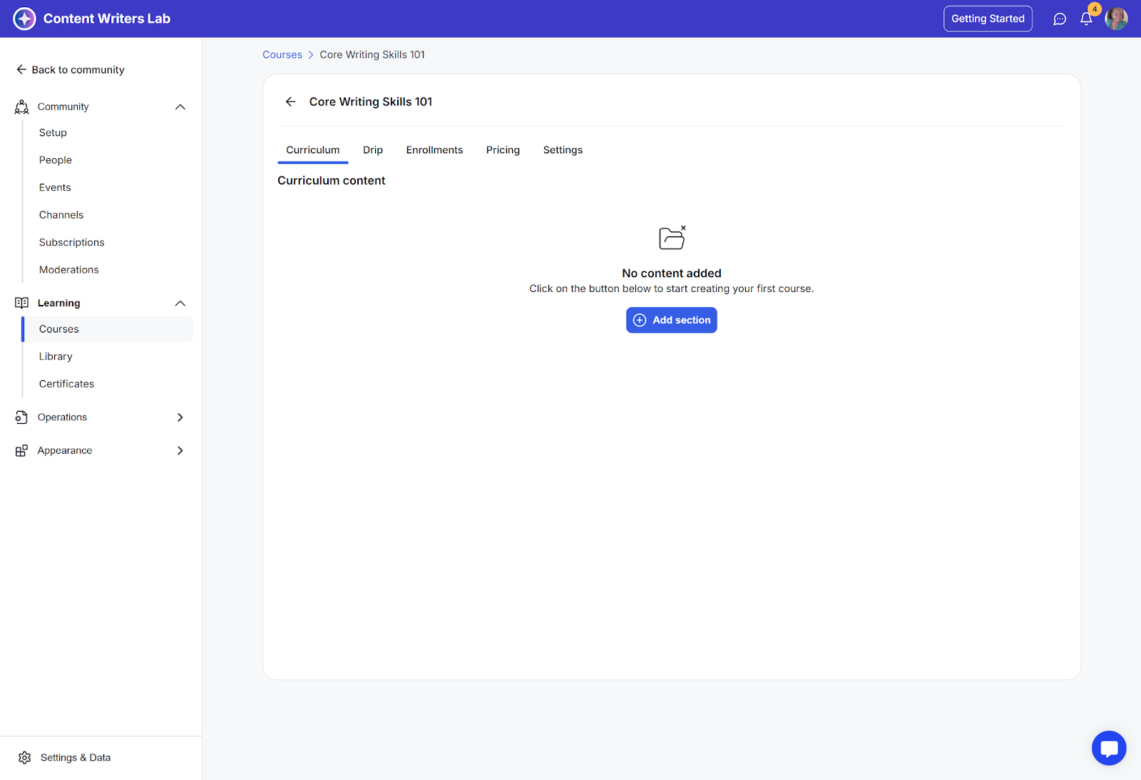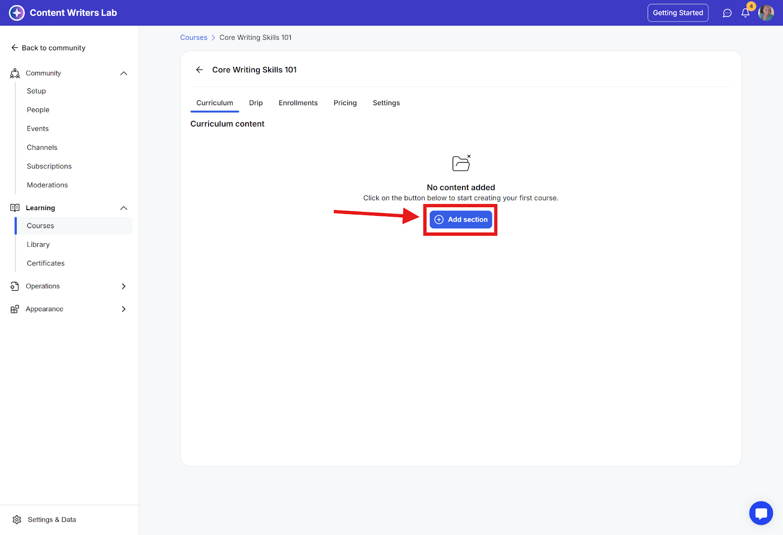 Step 6: Click Add Section to create a module for your course. Course sections help you organize your course into manageable parts, making it easier for learners to follow along.
