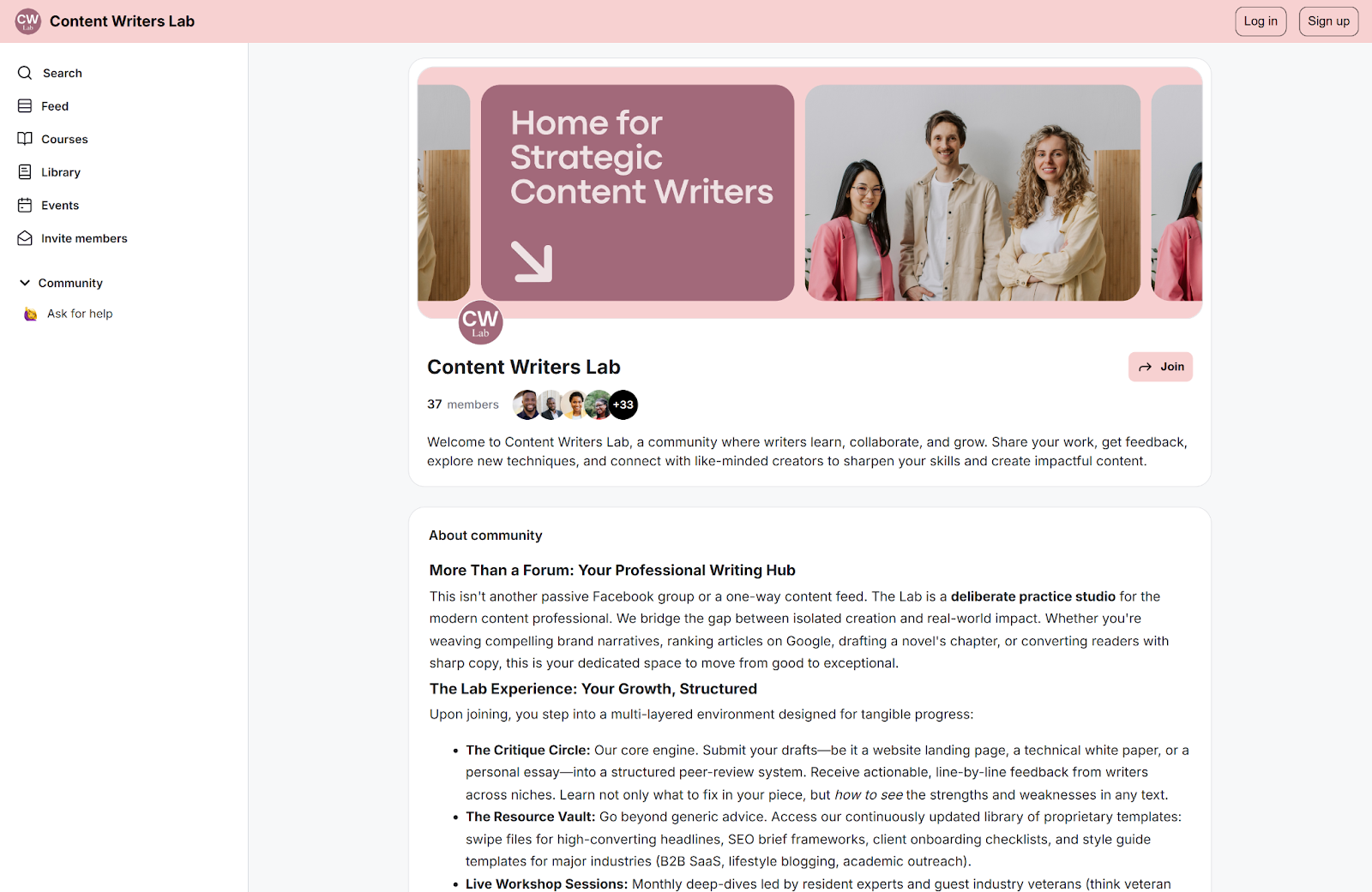 Community Description: This section goes deeper into who the community is for, what members can expect, and the type of support, resources, and activities available. It helps potential members feel connected before they join.