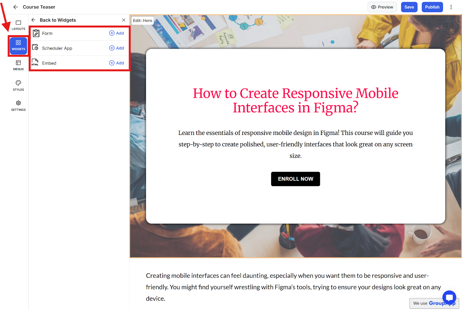 Custom HTML embeds (TypeForm, Google Forms, etc.) Note: Widgets appear as pop-ups and must be triggered by buttons.