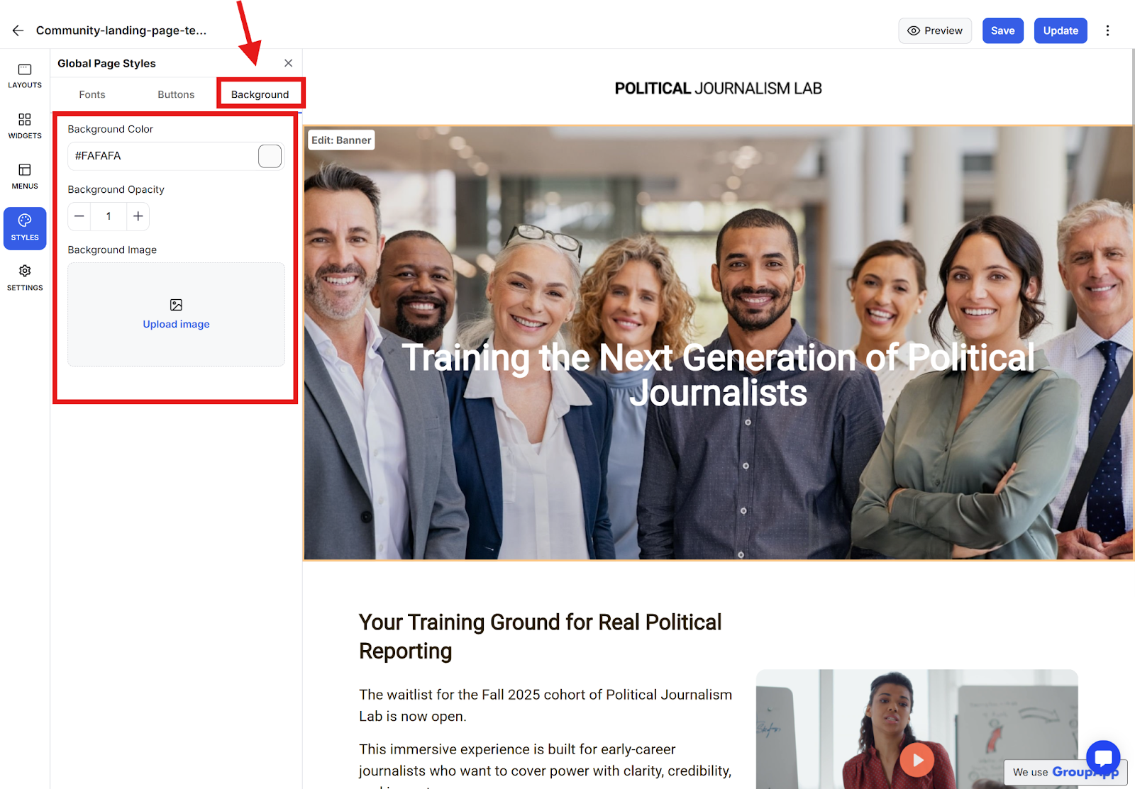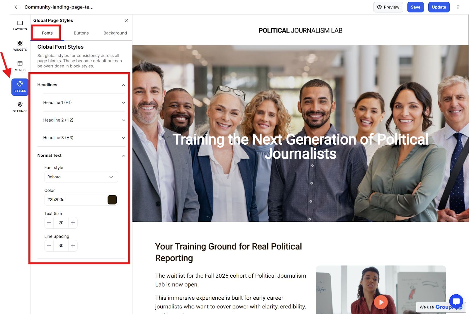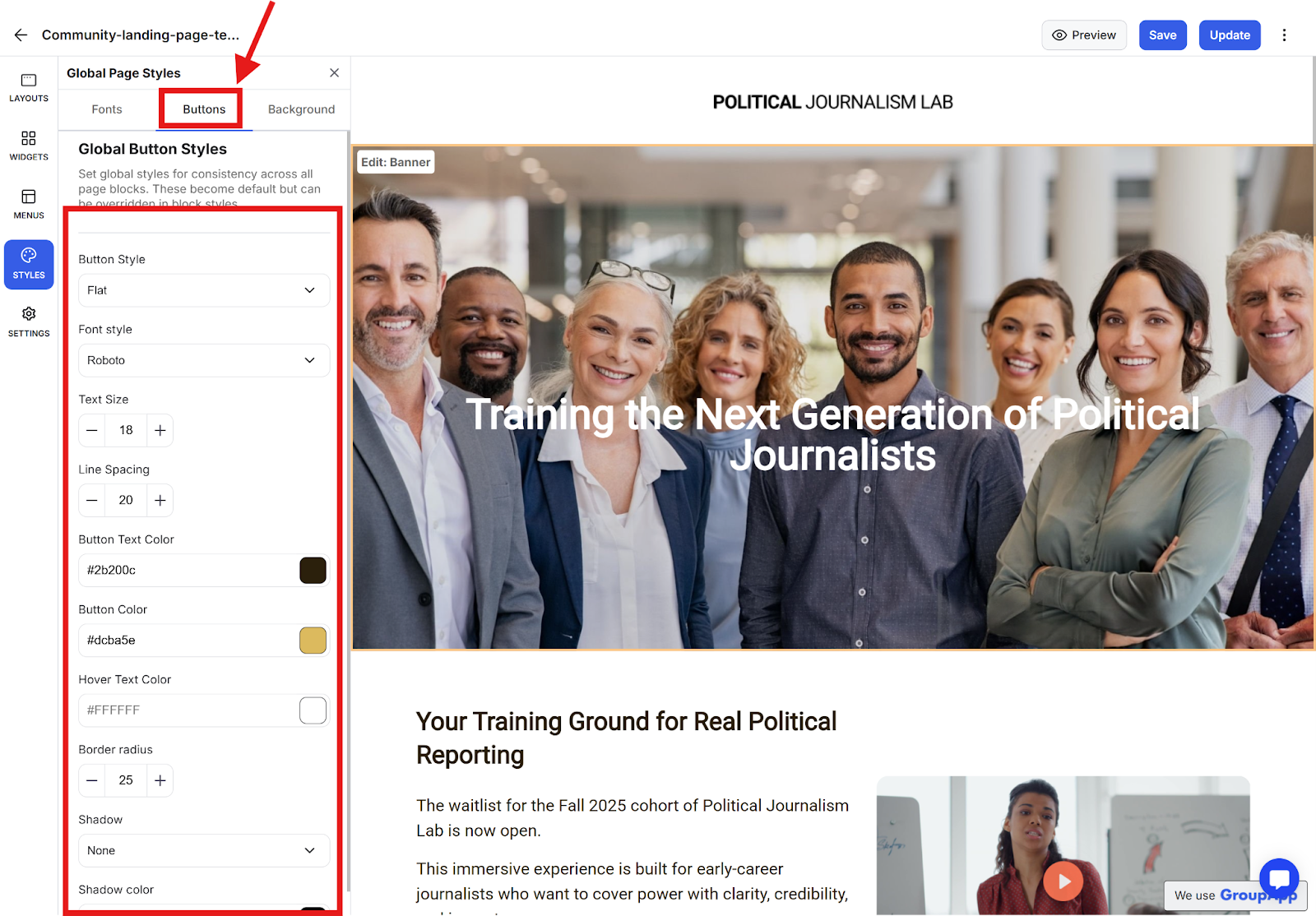 Under the Styles tab, you can apply consistent styling to all buttons across your landing page.