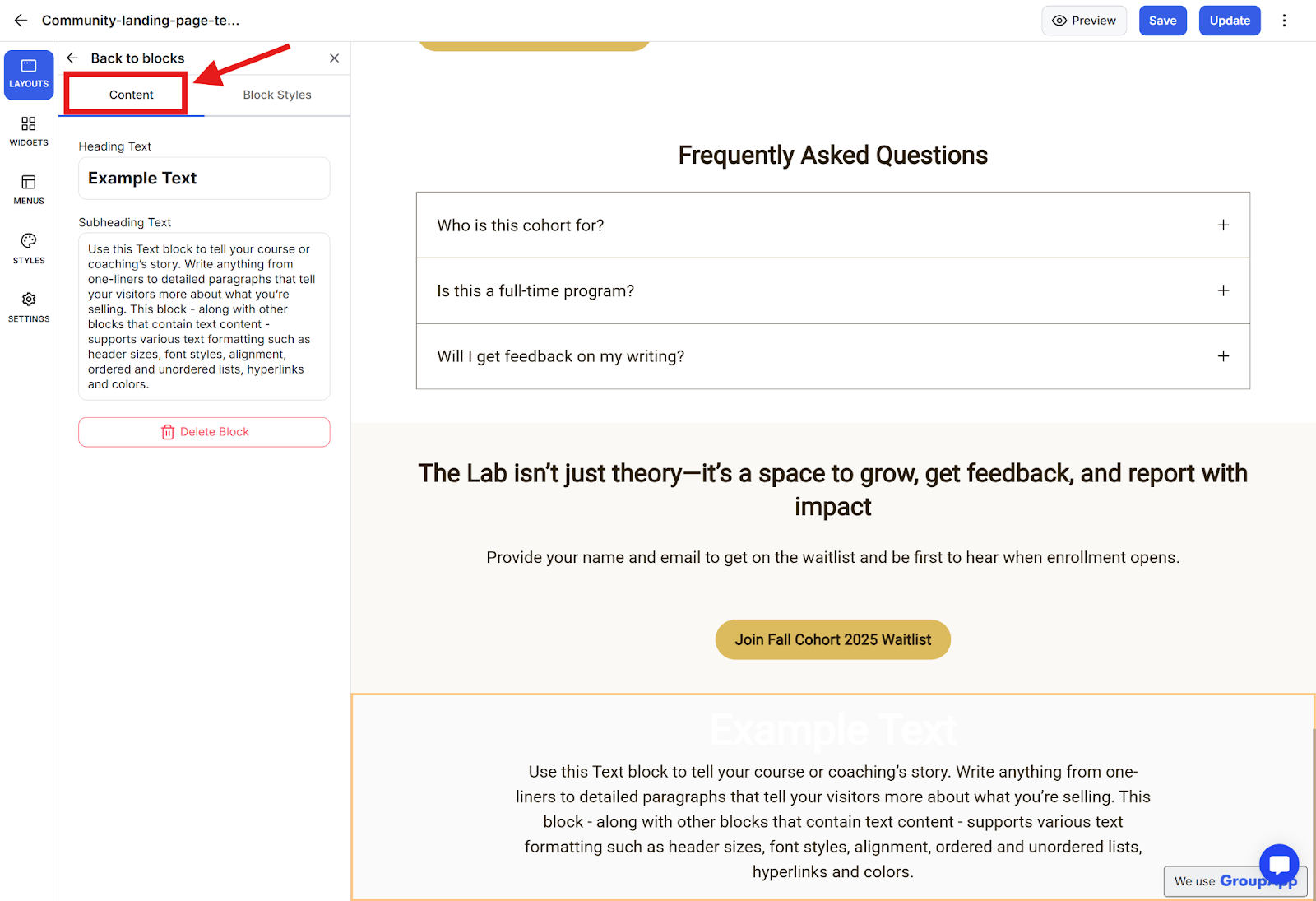 After adding a block (such as a Heading and Text Block), you can: