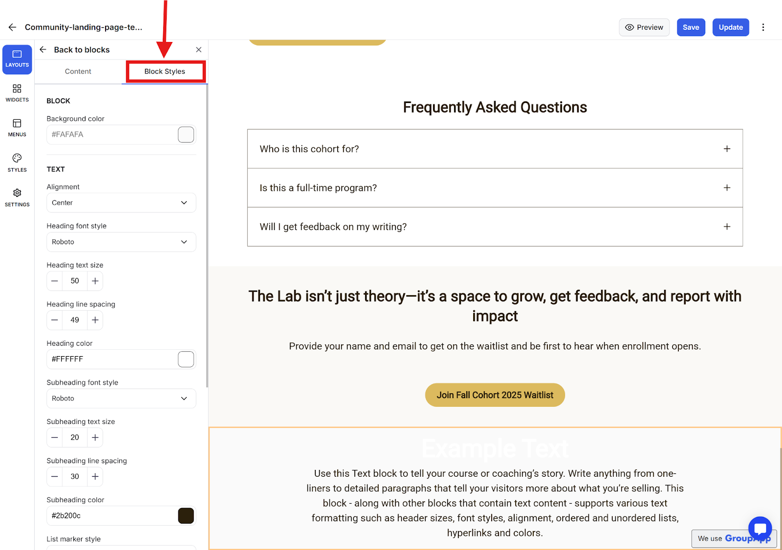 Style the block using the Block Styles tab