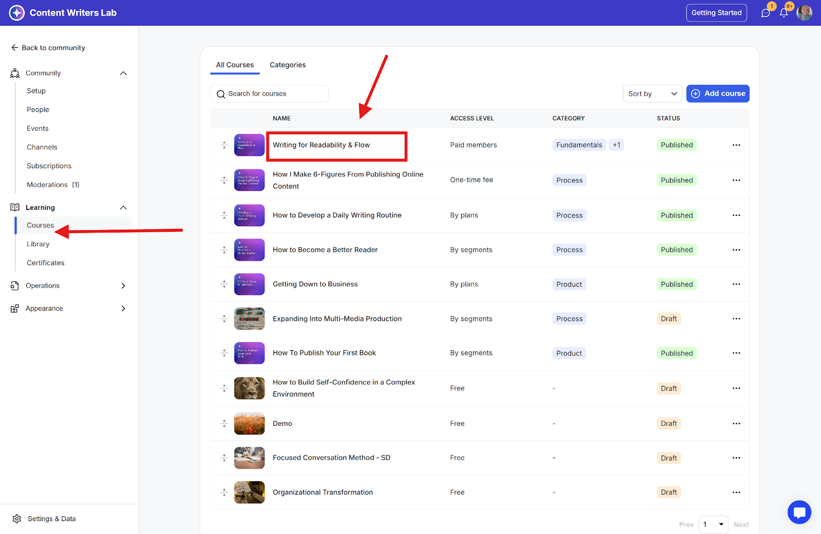 Step 2: Click Course or Library content and locate the one you want to manage.