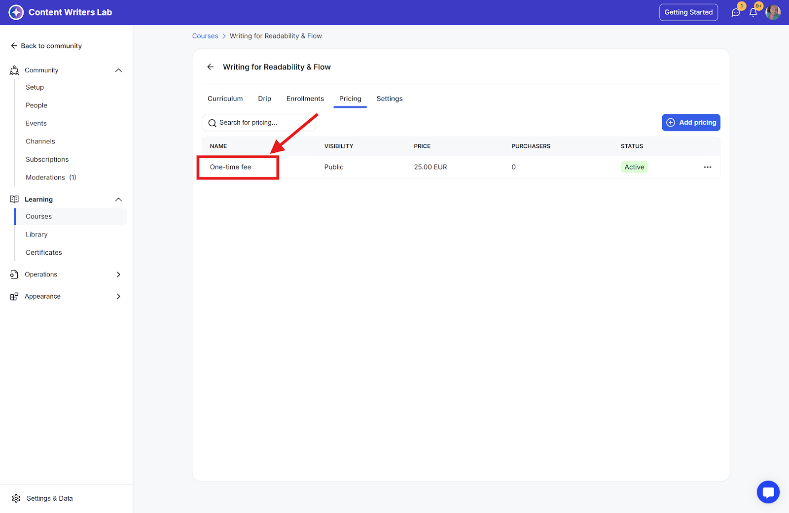 Step 4: Create a new pricing option or select an existing one, then click on it.