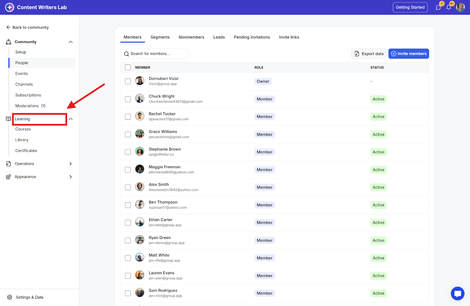 Step 1: Go to the Admin Panel and click Learning on the side menu.