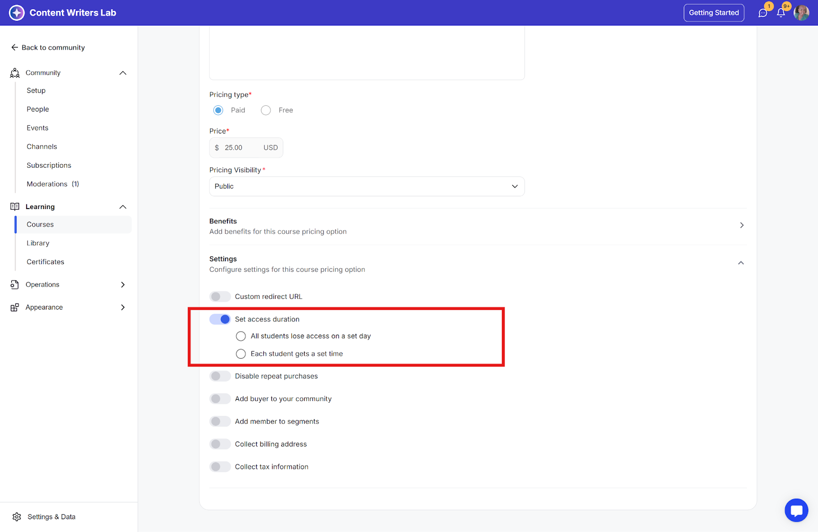 Control how long your students can access your content by setting specific time periods or end dates. Access duration helps you create urgency, manage content availability, and structure your course delivery effectively.